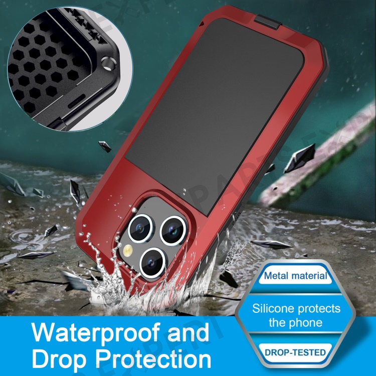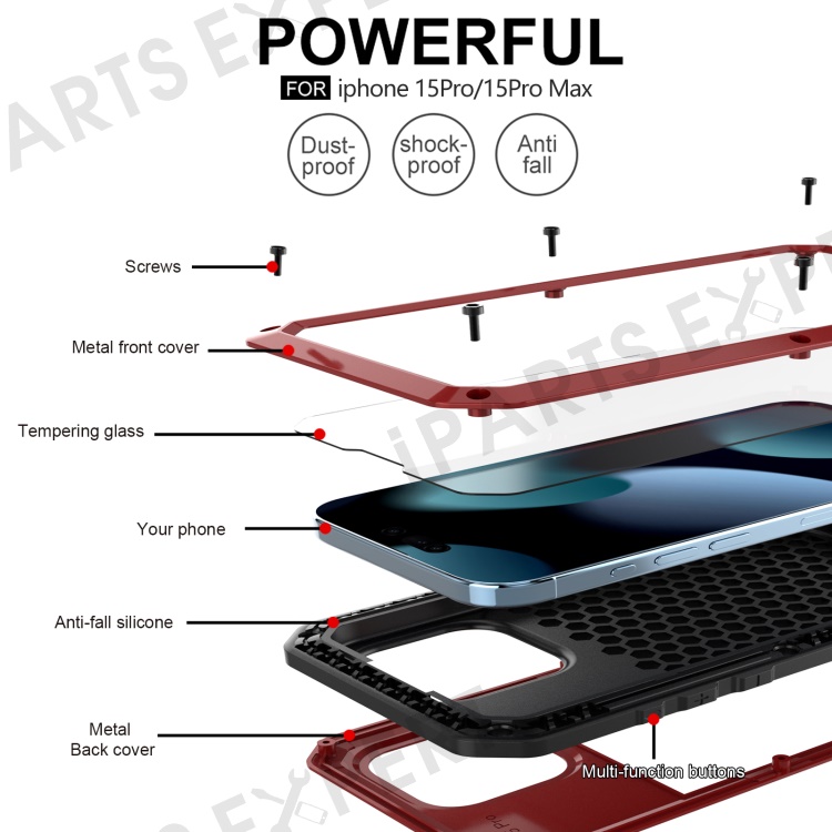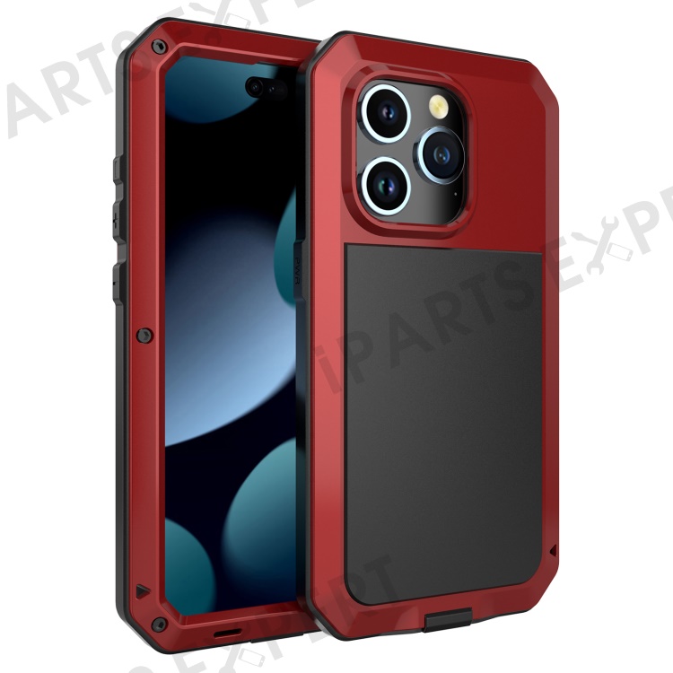 For iPhone 15 Pro Silicone+PC+Metal Phone Case Full Protection Cover with Tempered Glass Film - Red