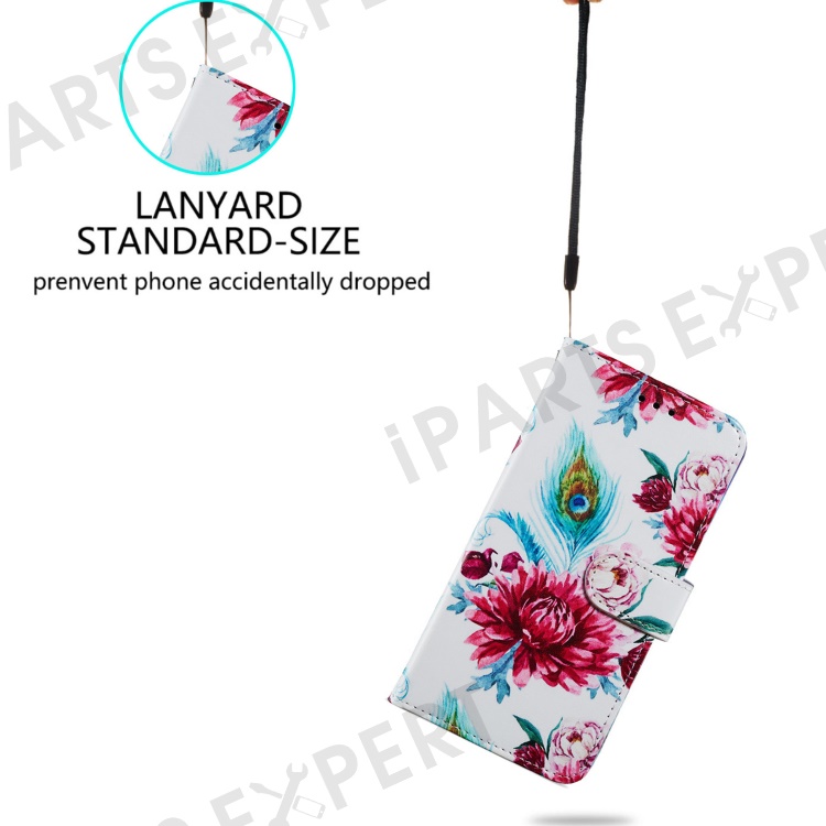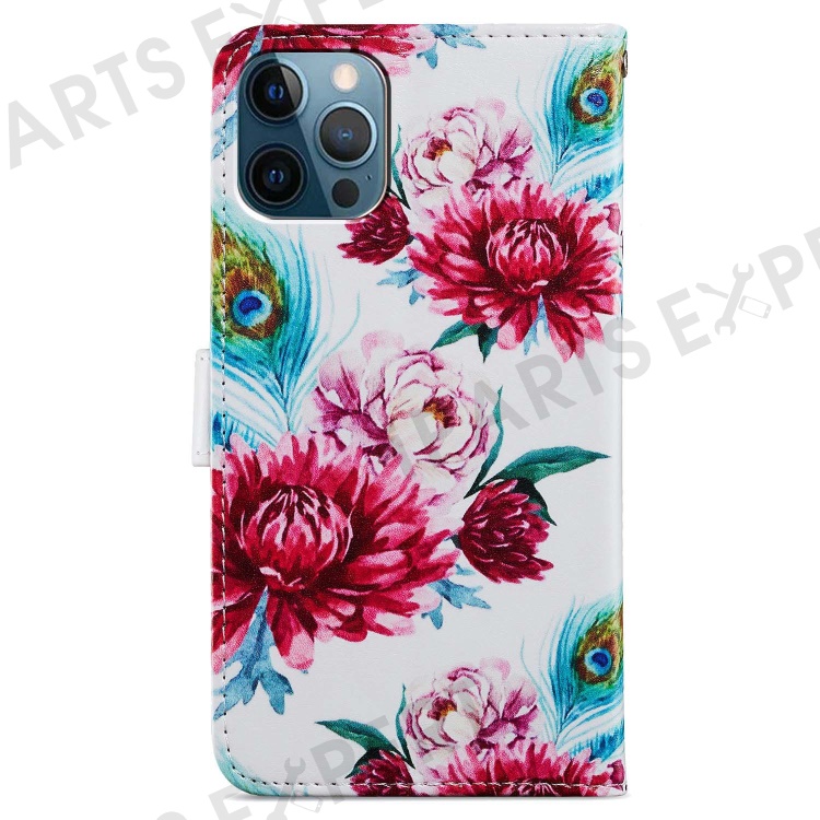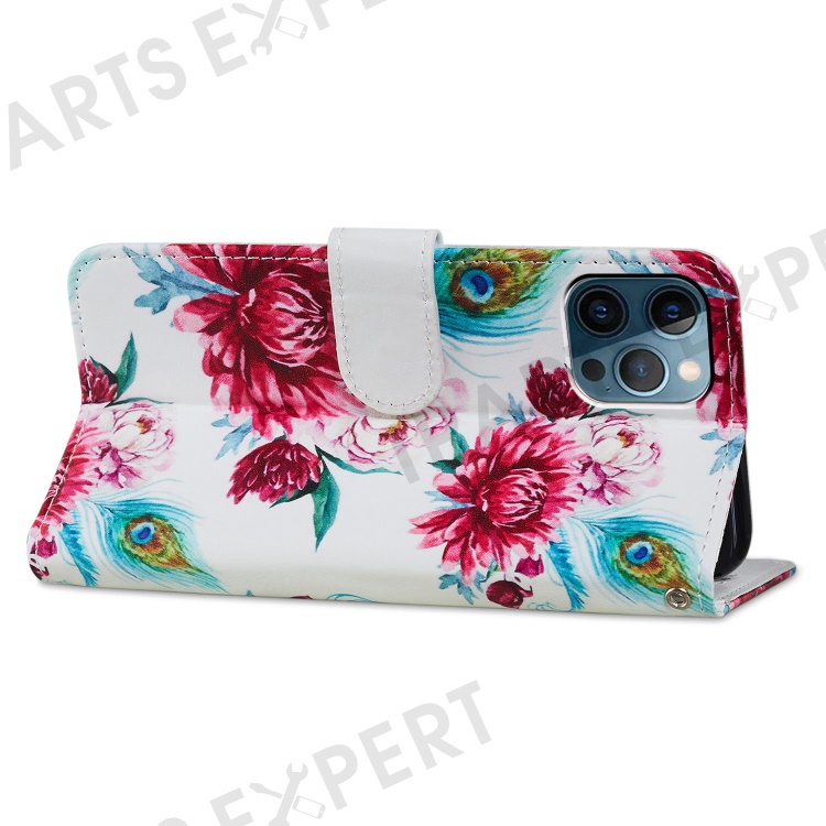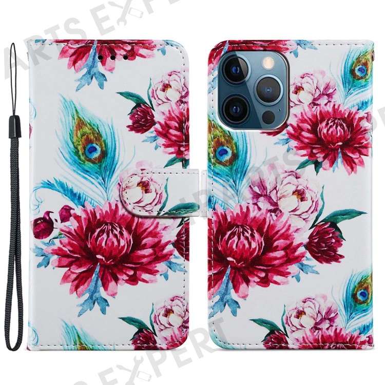 For iPhone 15 Pro Stand Phone Case Pattern Printing PU Leather Wallet Cover with Strap - Peacock Flower