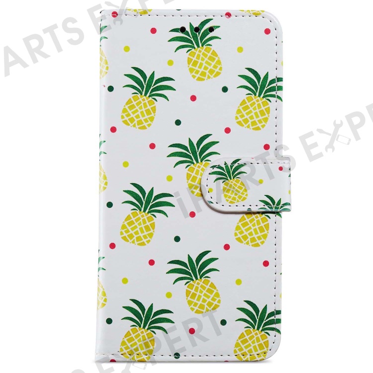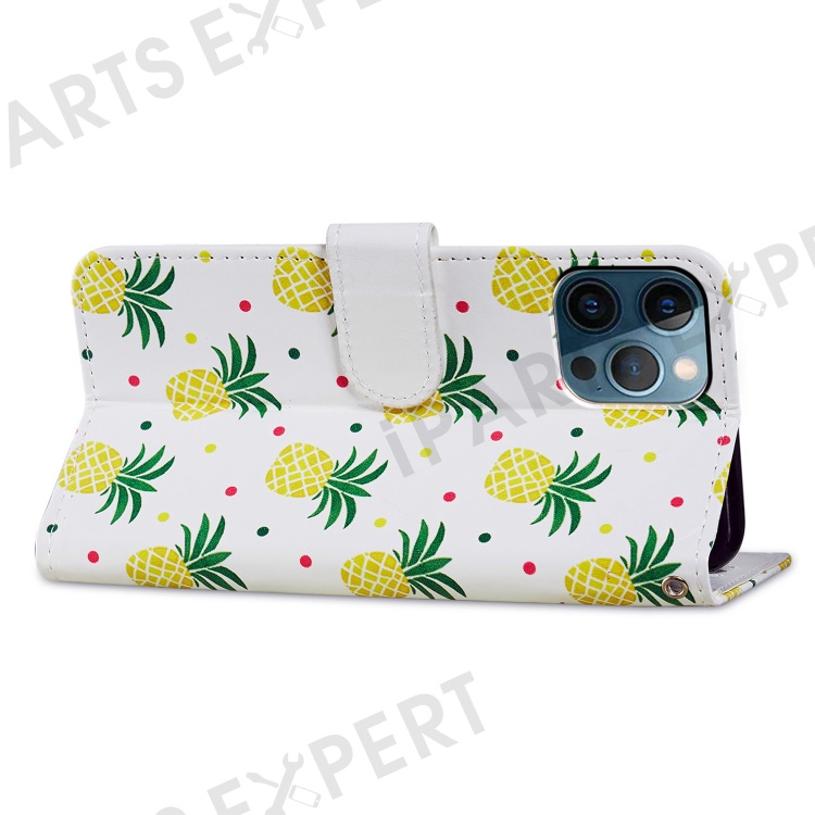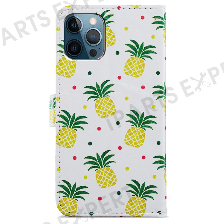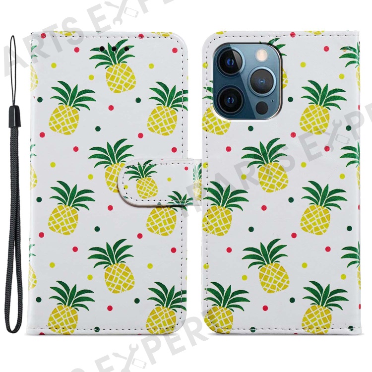 For iPhone 15 Pro Stand Phone Case Pattern Printing PU Leather Wallet Cover with Strap - Pineapple