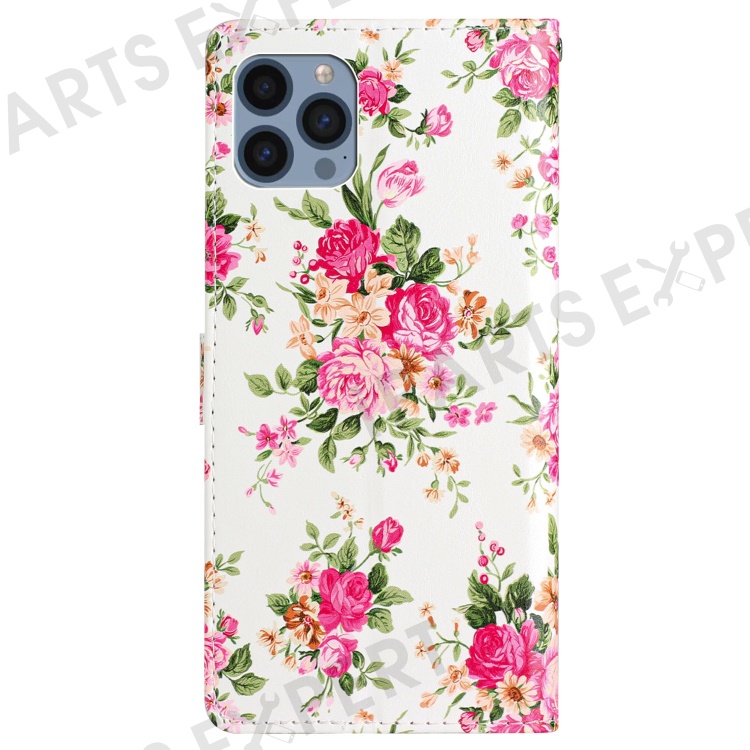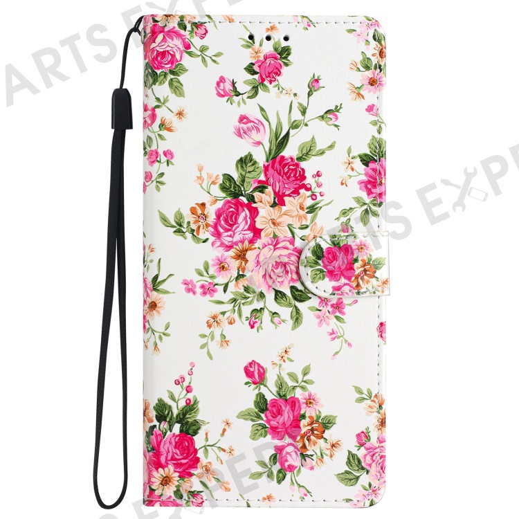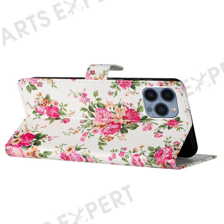 For iPhone 15 Pro Stand Phone Case Pattern Printing PU Leather Wallet Cover with Strap - Red Flowers