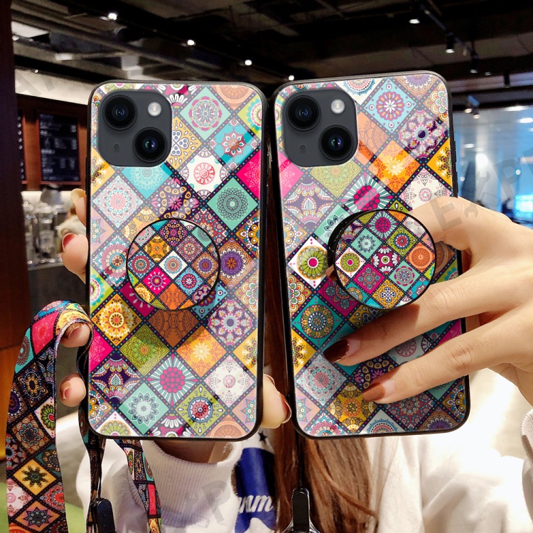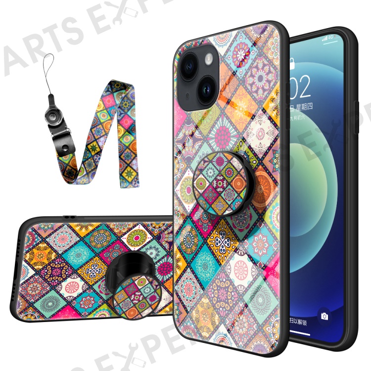 For iPhone 15 Tempered Glass+PC+TPU Case Flower Pattern Phone Kickstand Cover with Lanyard - Checkered Pattern