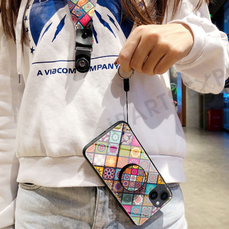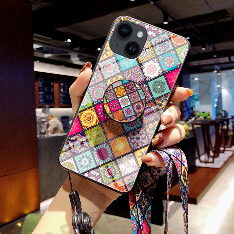 For iPhone 15 Tempered Glass+PC+TPU Case Flower Pattern Phone Kickstand Cover with Lanyard - Color Pattern