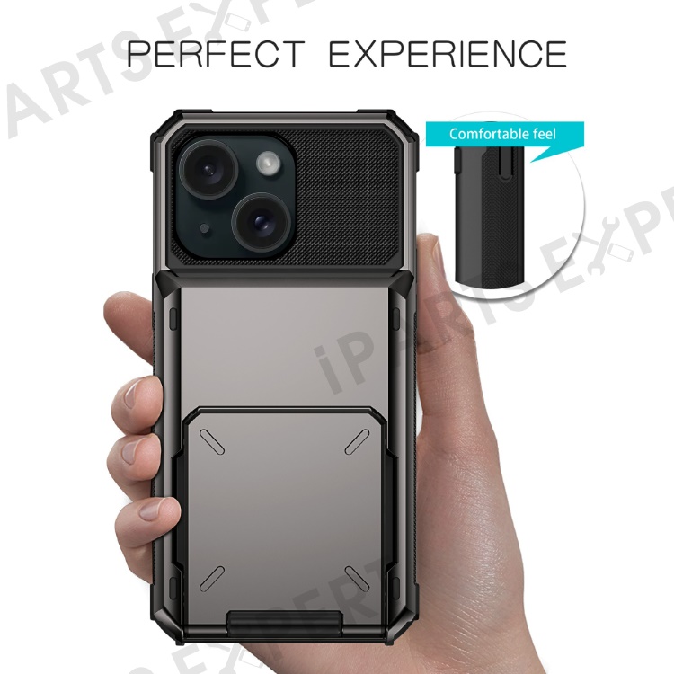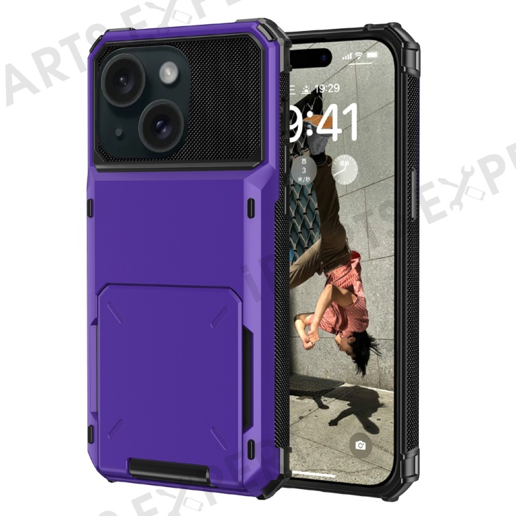 For iPhone 15 TPU + PC Shockproof Phone Case Flip Card Holder Back Cover - Purple
