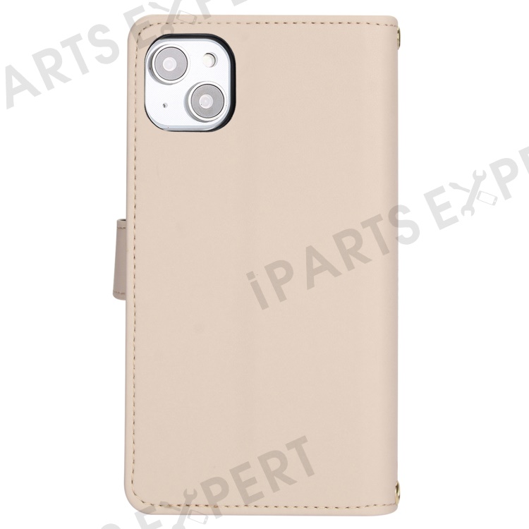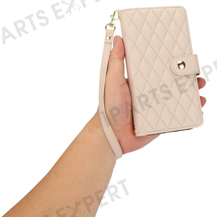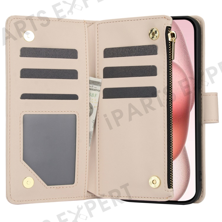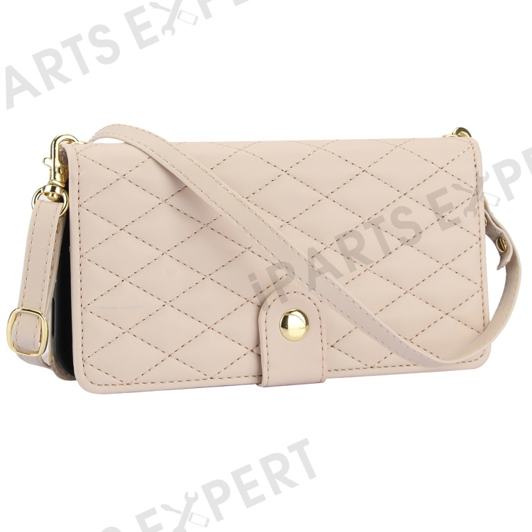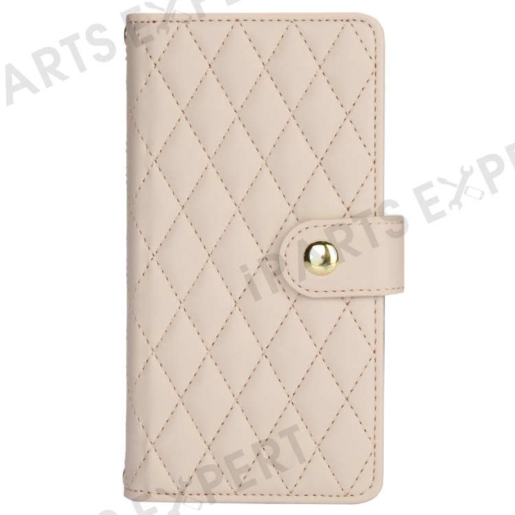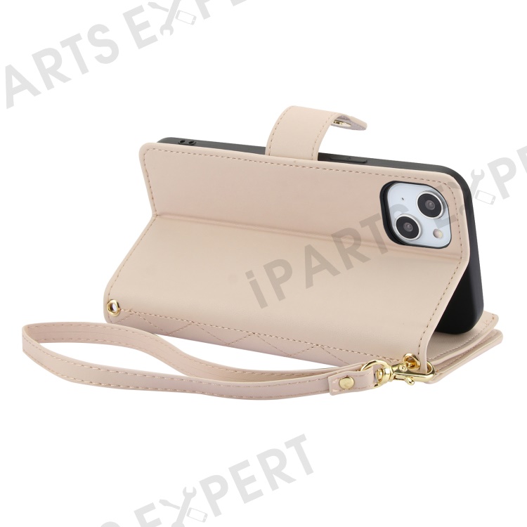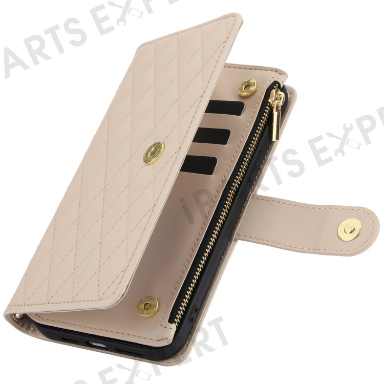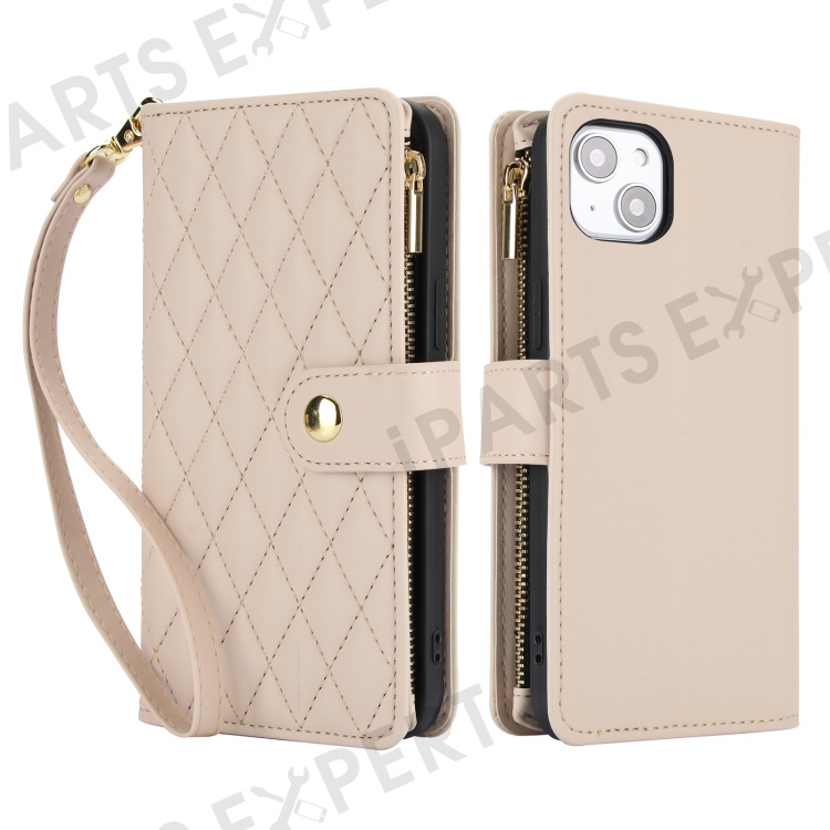 For iPhone 15 Zipper Wallet Case Rhombus Leather Phone Cover with Shoulder Strap - Apricot