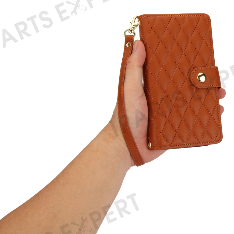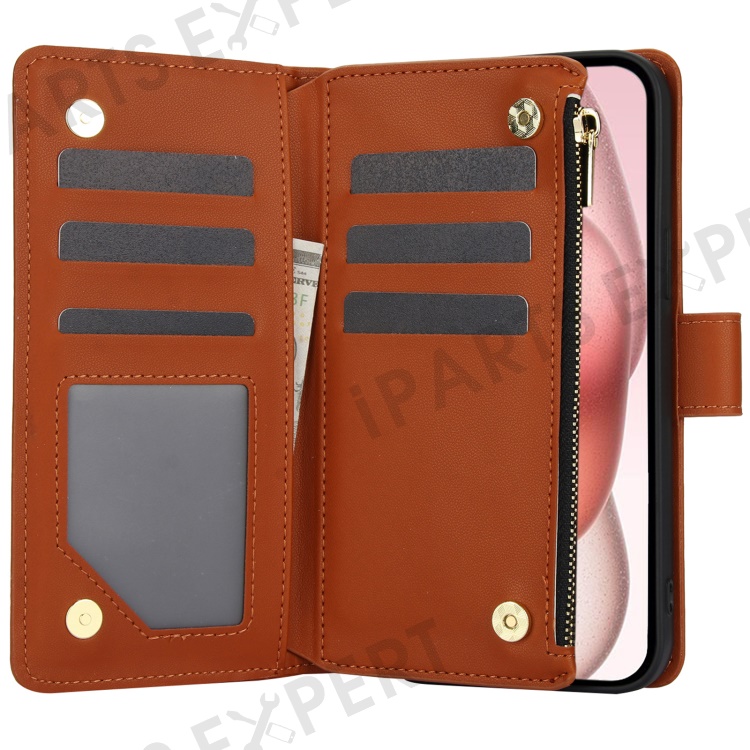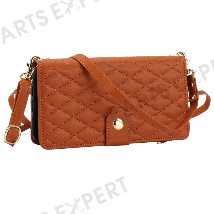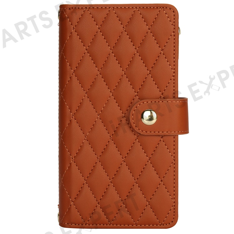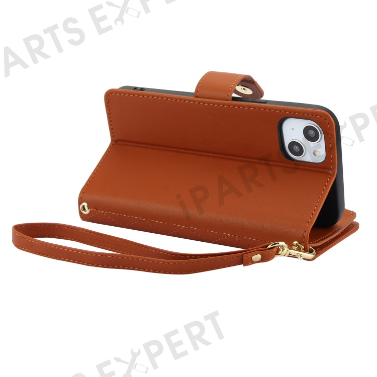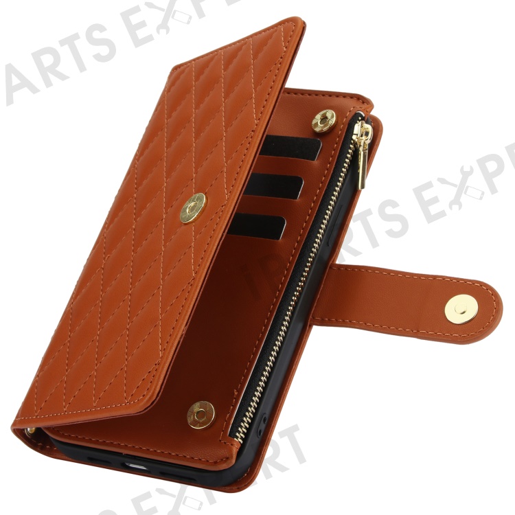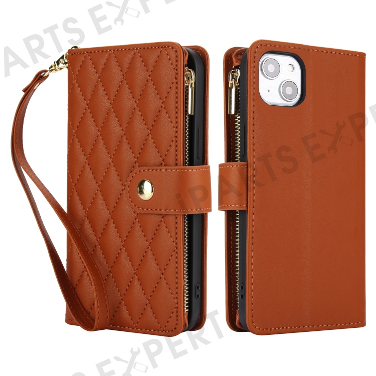 For iPhone 15 Zipper Wallet Case Rhombus Leather Phone Cover with Shoulder Strap - Brown