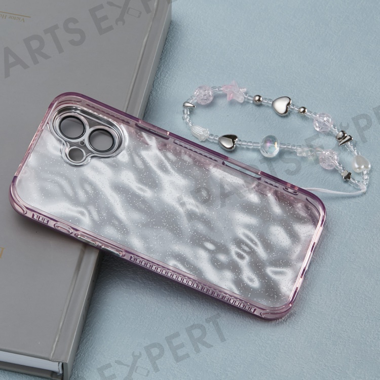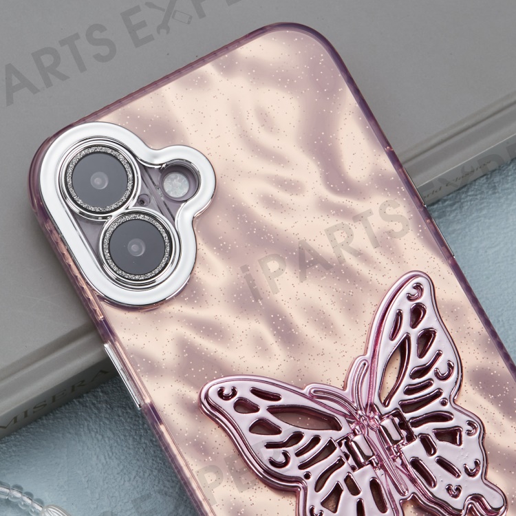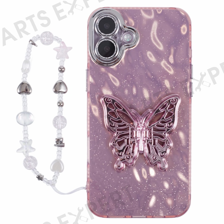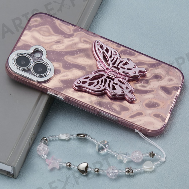 For iPhone 16 Case Butterfly Kickstand PC+TPU IMD Phone Cover with Lens Film / Beaded Strap - Wrinkle Pattern / Pink