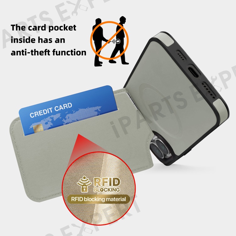 For iPhone 16 Case Compatible with MagSafe RFID Blocking Card Slot Leather Back Cover - Grey