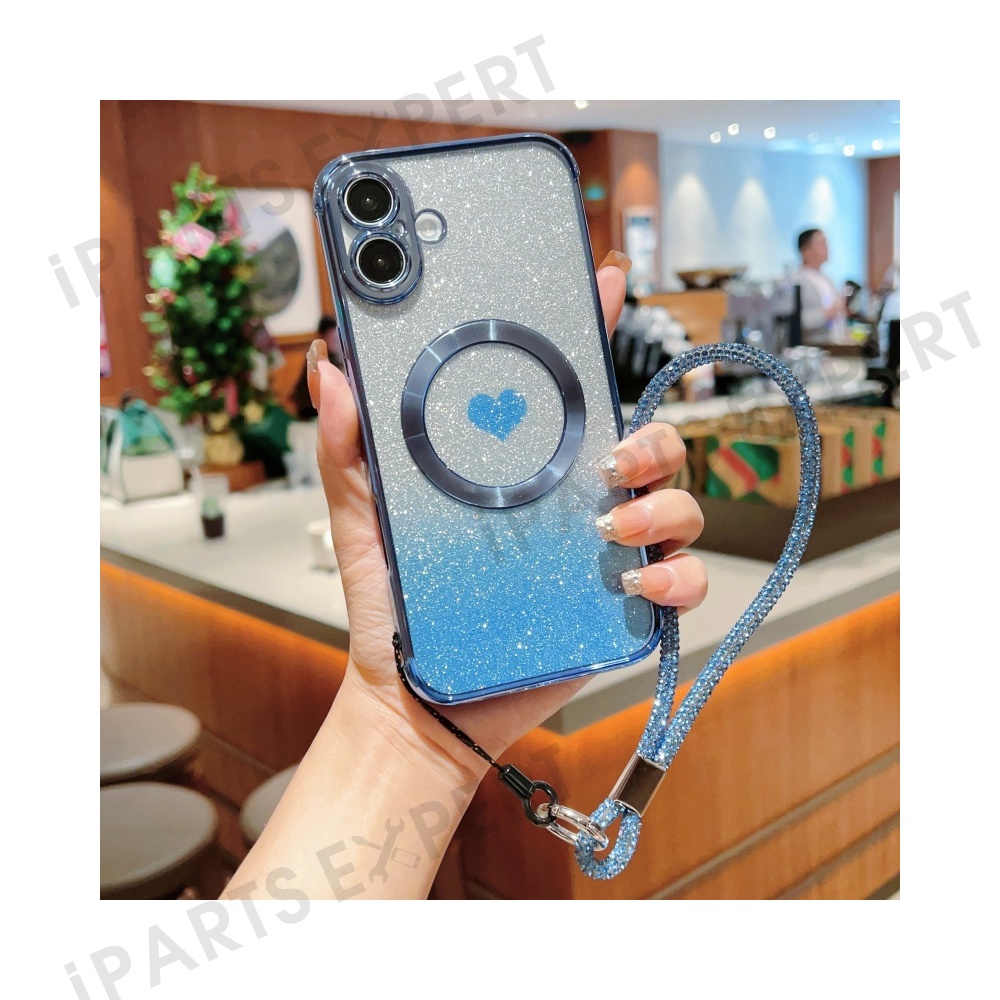 For iPhone 16 Case Compatible with MagSafe TPU Phone Cover with Strap Heart Gradient Sparkle - Blue