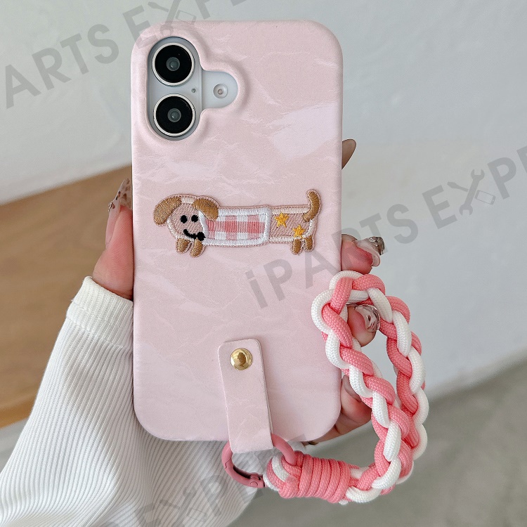 For iPhone 16 Case Cute Pattern Soft PU+PC Phone Back Cover with Braided Handy Strap - Pink Dog