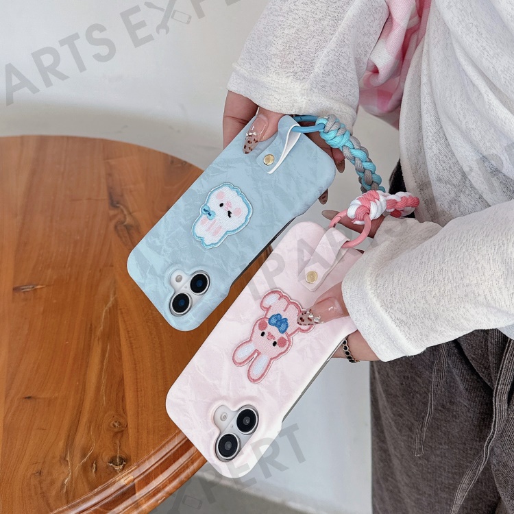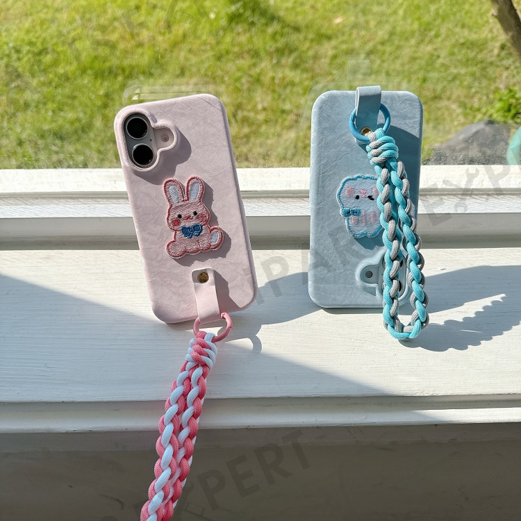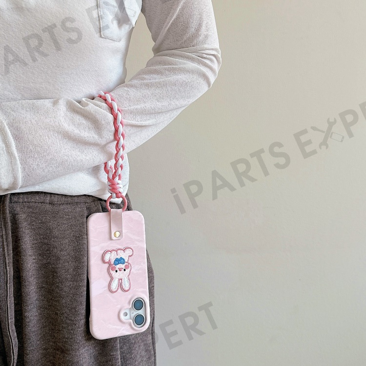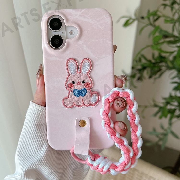 For iPhone 16 Case Cute Pattern Soft PU+PC Phone Back Cover with Braided Handy Strap - Pink Rabbit