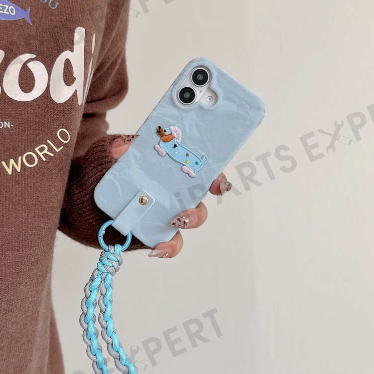 For iPhone 16 Case Cute Pattern Soft PU+PC Phone Back Cover with Braided Handy Strap - Sky Blue Dog