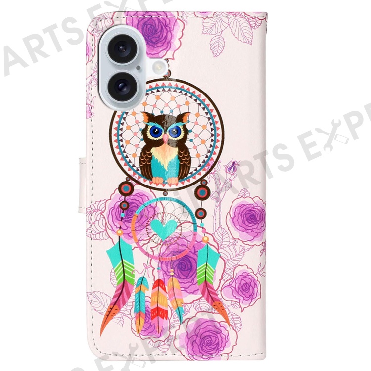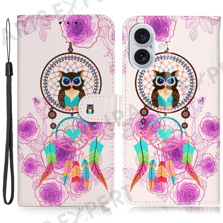For iPhone 16 Case Leather Card Slot Holder Flip Phone Cover Pattern Printing - Wind Chime Owl