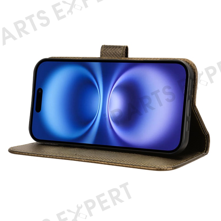For iPhone 16 Case PU Leather Diamond Texture Wallet Phone Cover - Brown