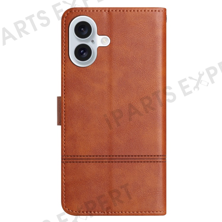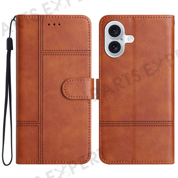 For iPhone 16 Case PU Leather Phone Cover Card Slots Wrist Strap Line Pattern - Brown