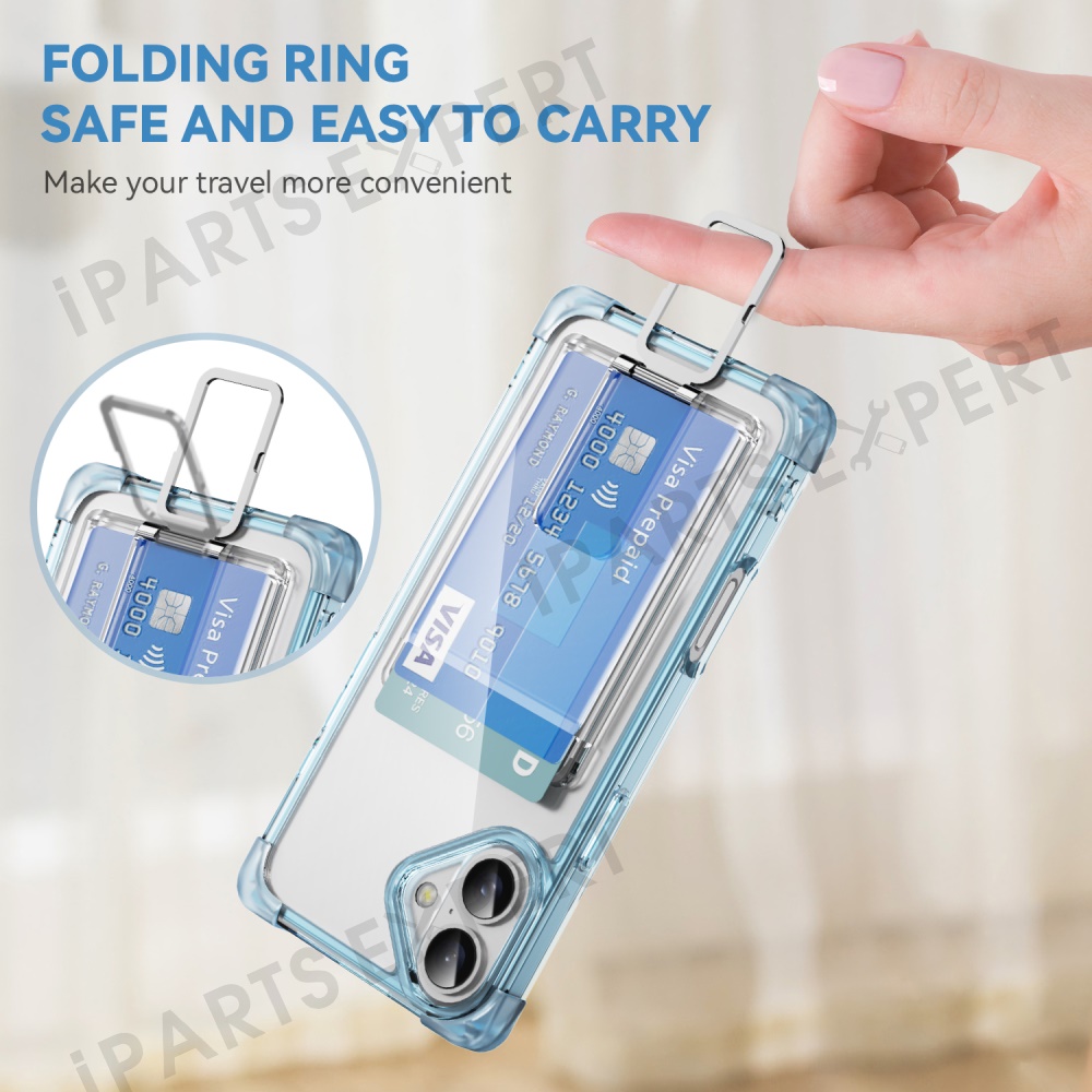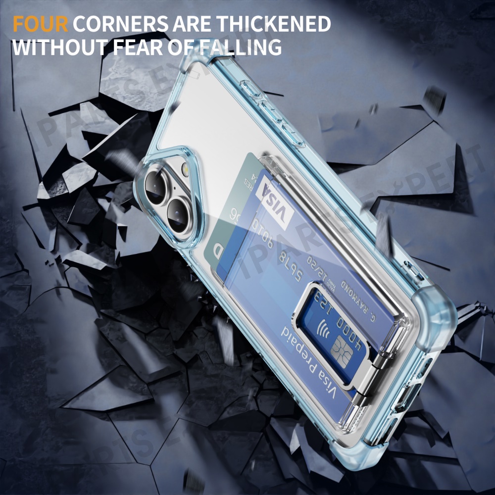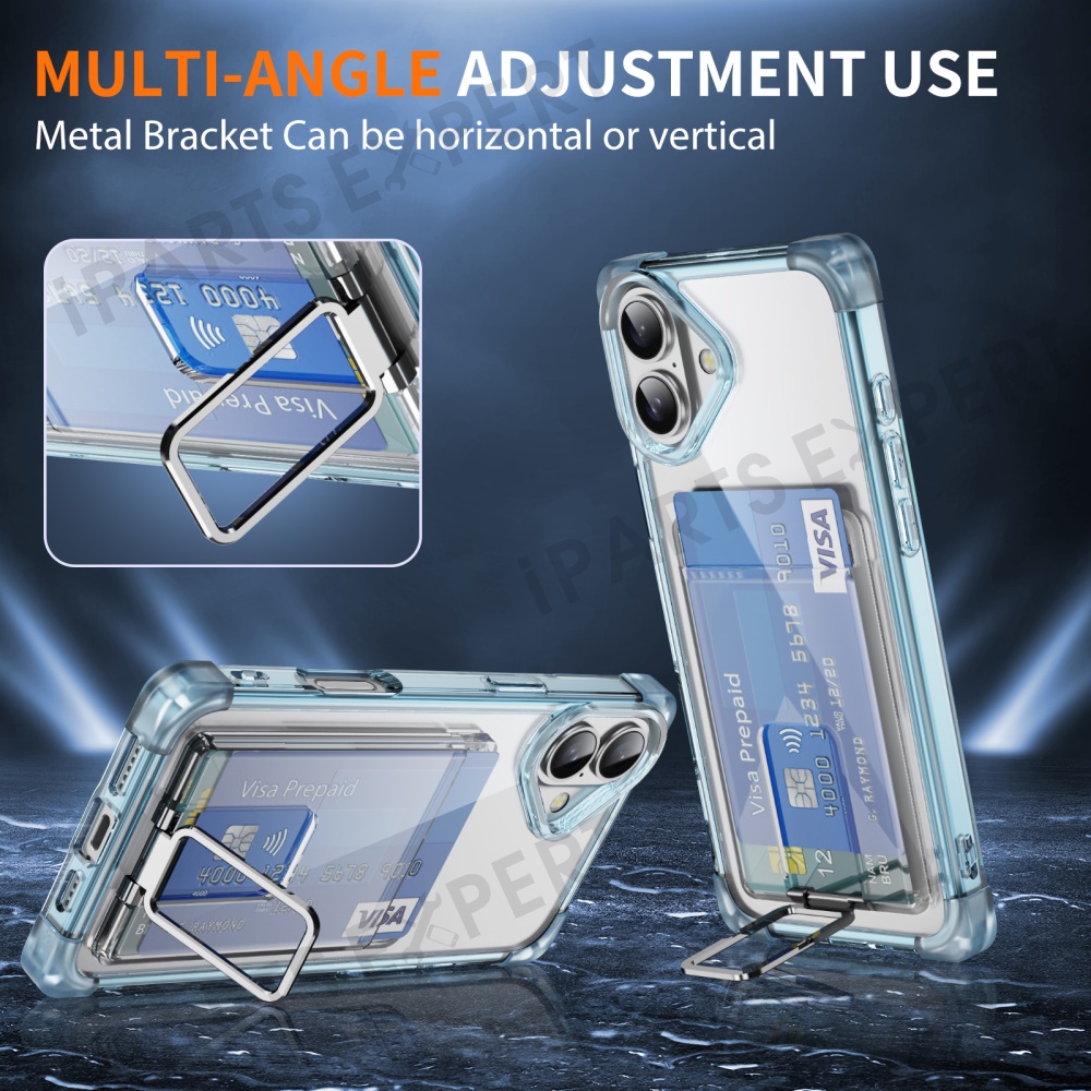 For iPhone 16 Case Reinforced Corners TPU + Acrylic Phone Cover with Kickstand Card Holder - Transparent Blue