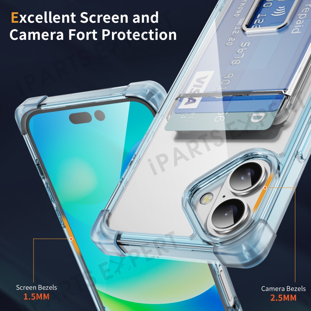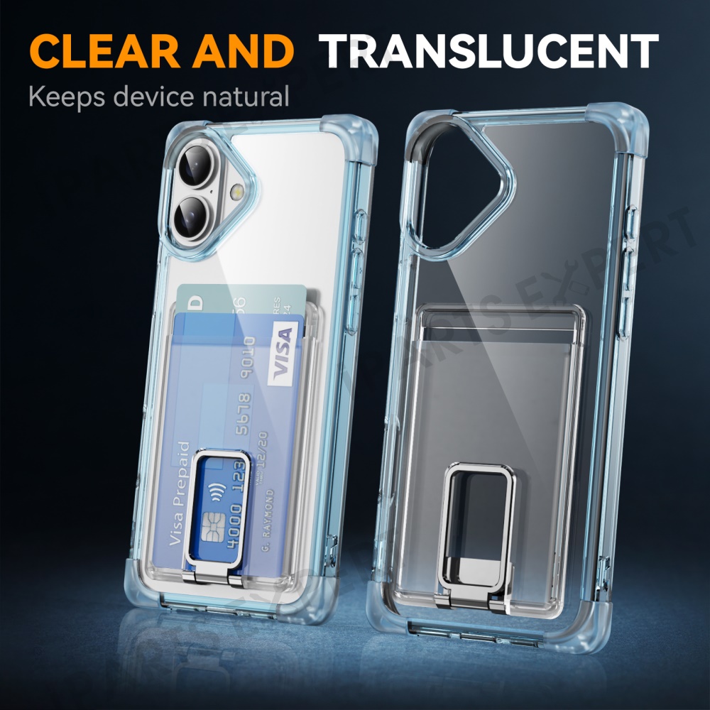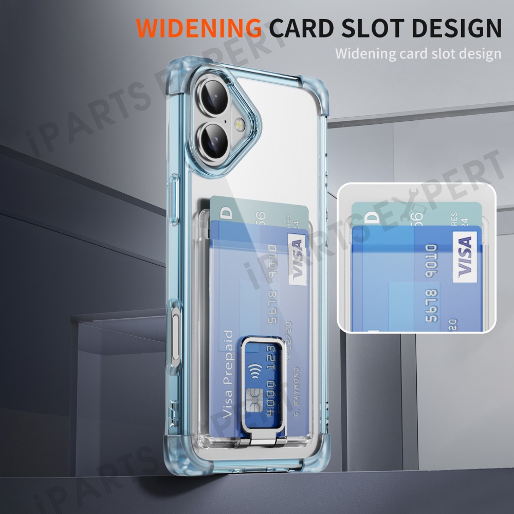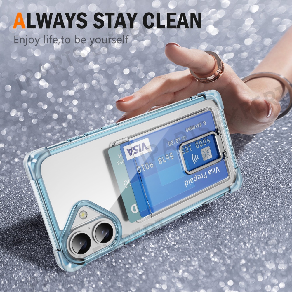 For iPhone 16 Case Reinforced Corners TPU + Acrylic Phone Cover with Kickstand Card Holder - Transparent Blue