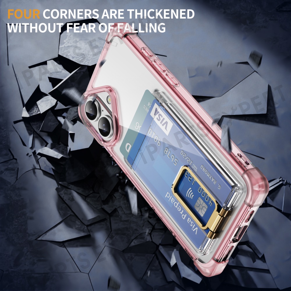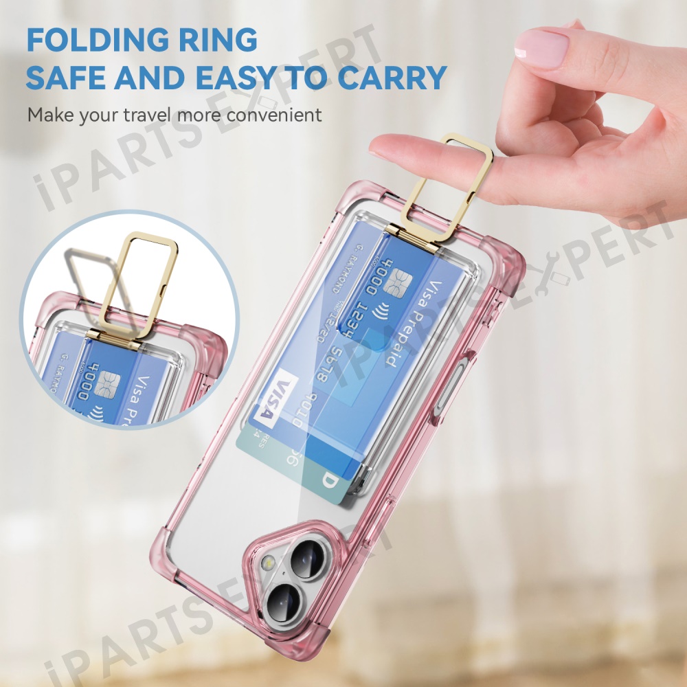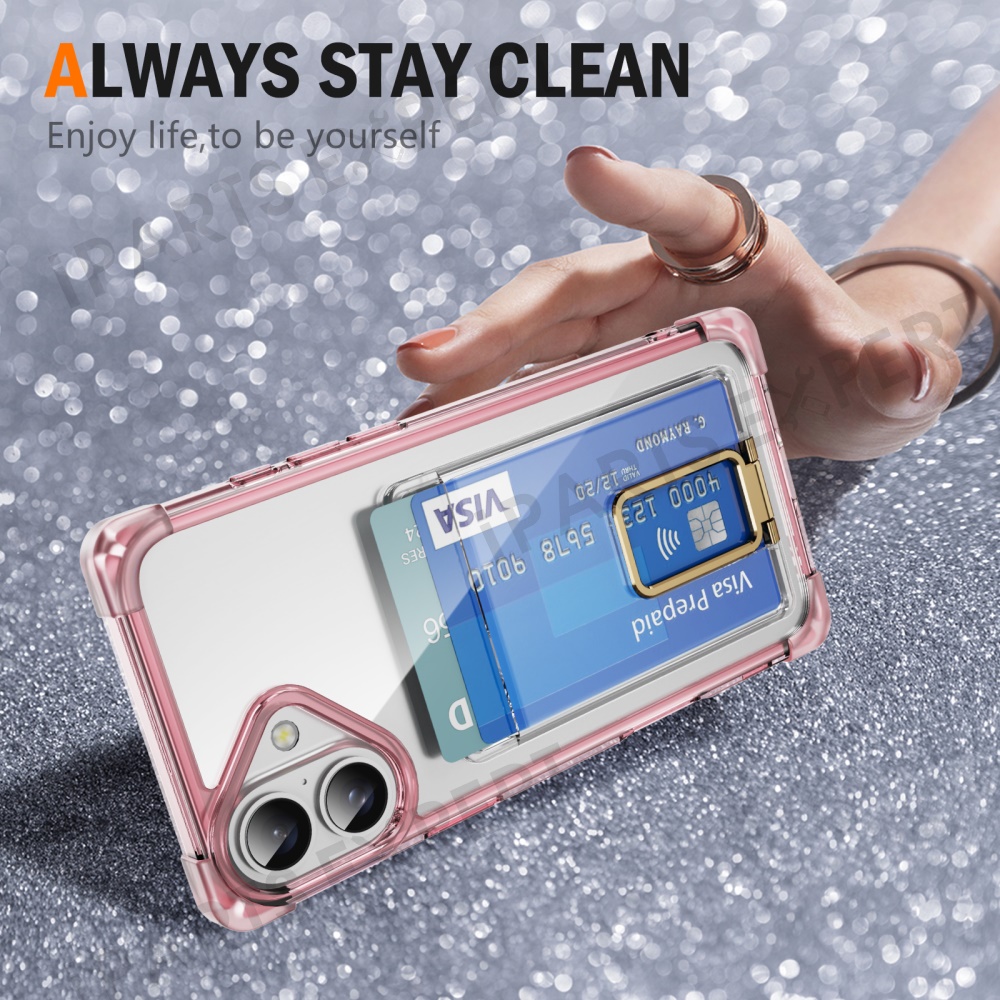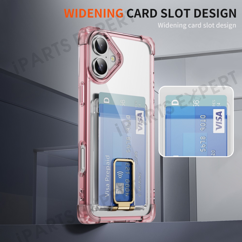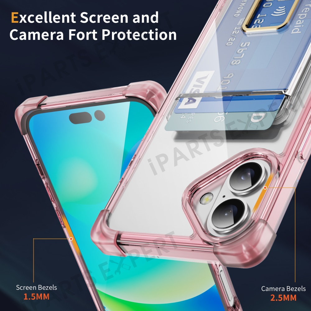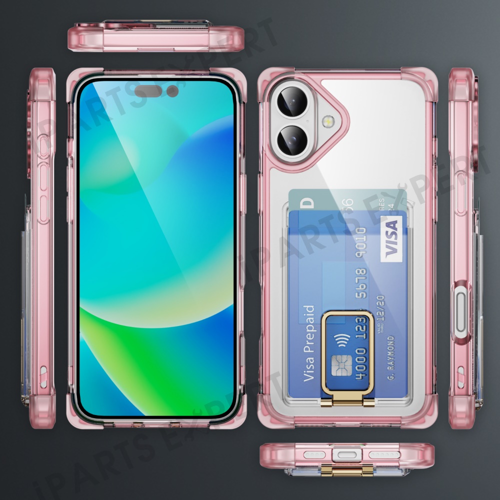 For iPhone 16 Case Reinforced Corners TPU + Acrylic Phone Cover with Kickstand Card Holder - Transparent Pink