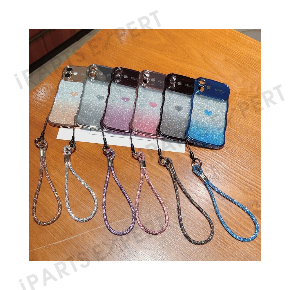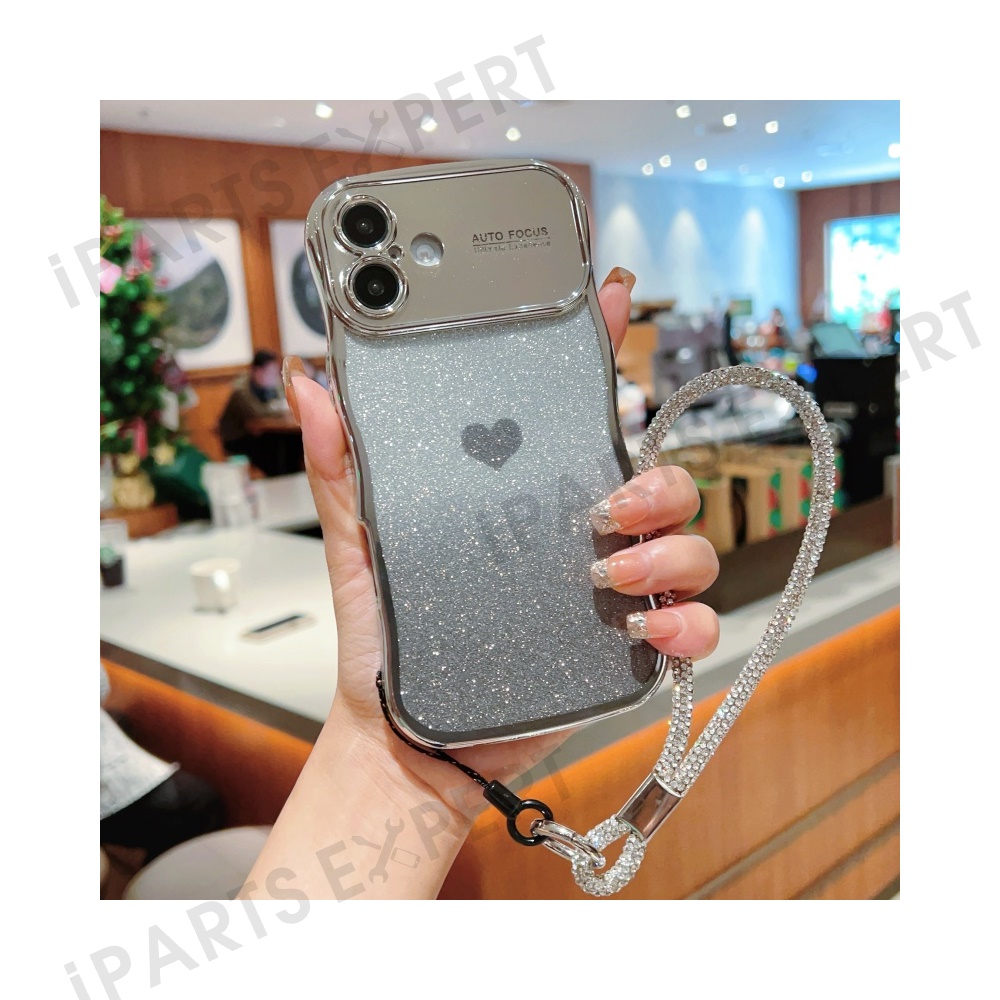 For iPhone 16 Case with Strap Electroplating TPU Phone Cover Love Heart Gradient Glitter - Silver