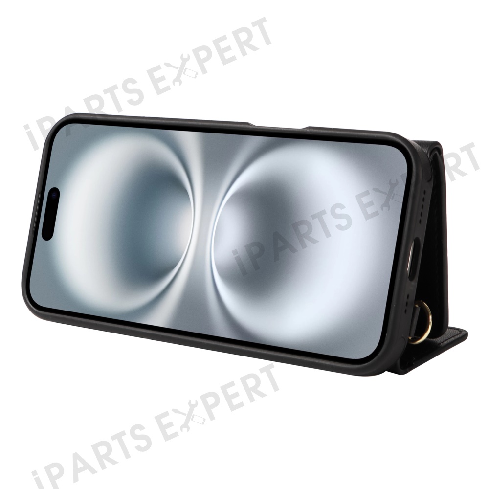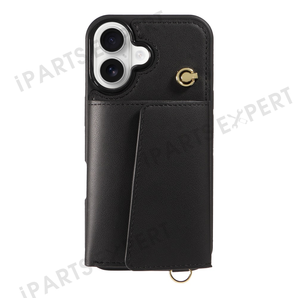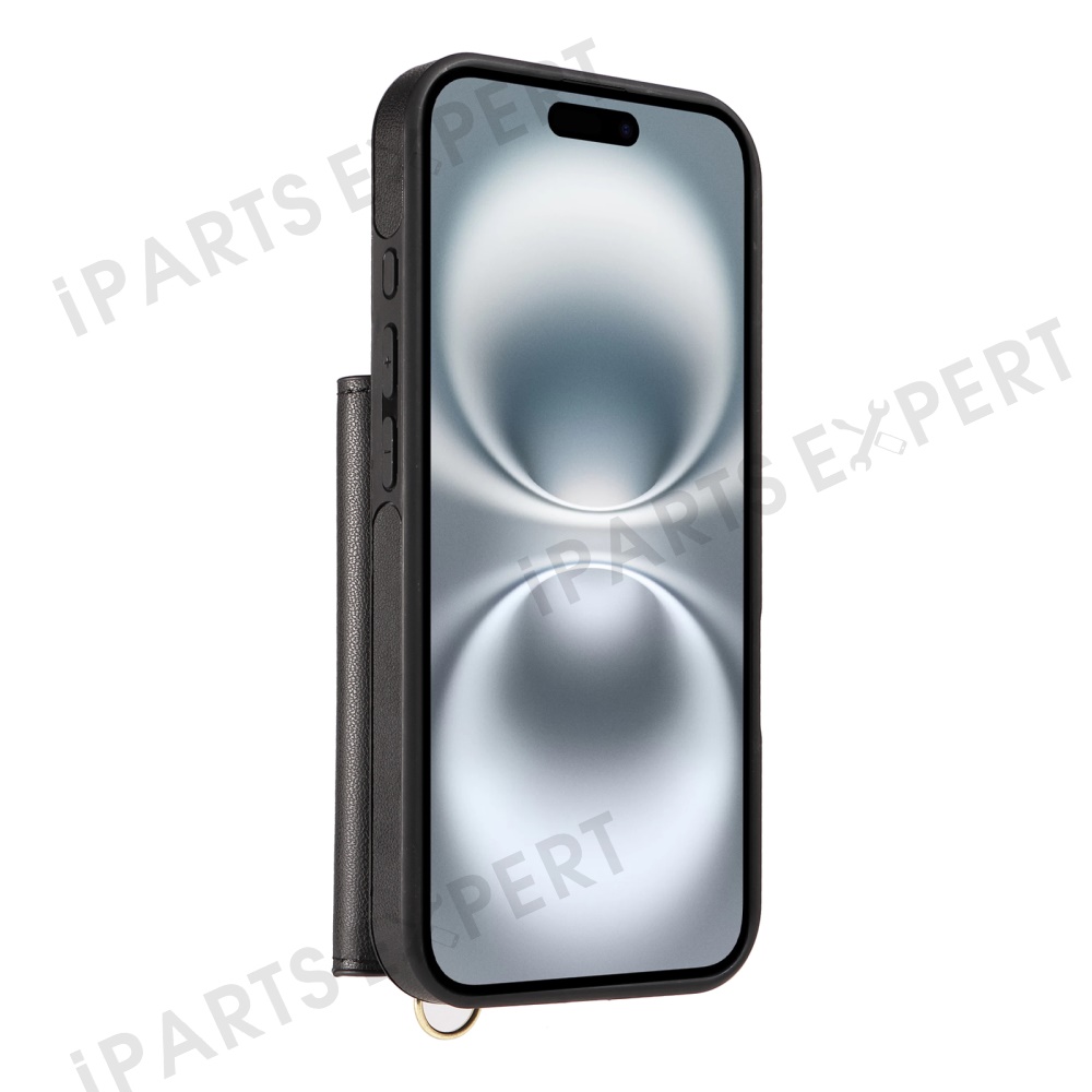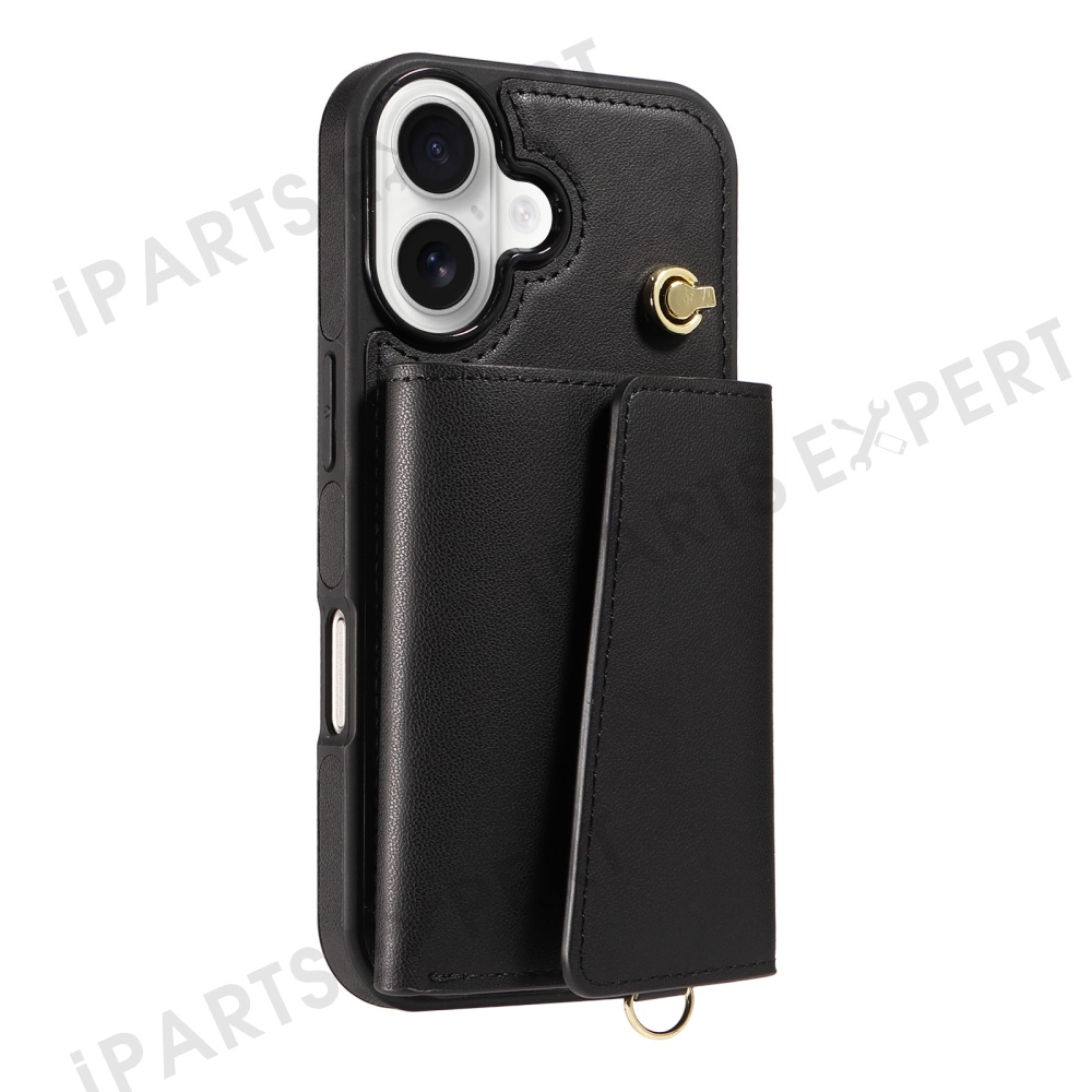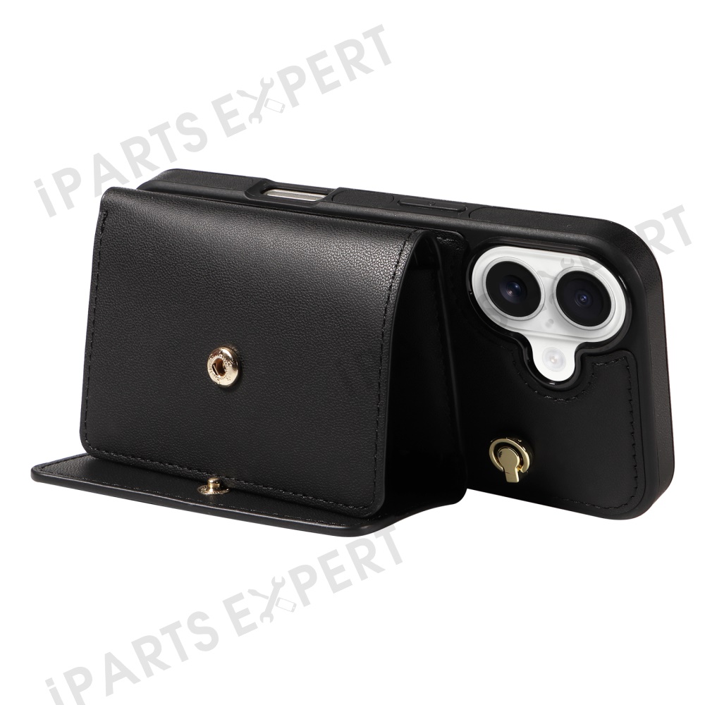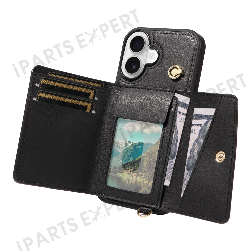 For iPhone 16 Crossbody Phone Case Card Holder Kickstand Leather Coated TPU Mobile Cover - Black