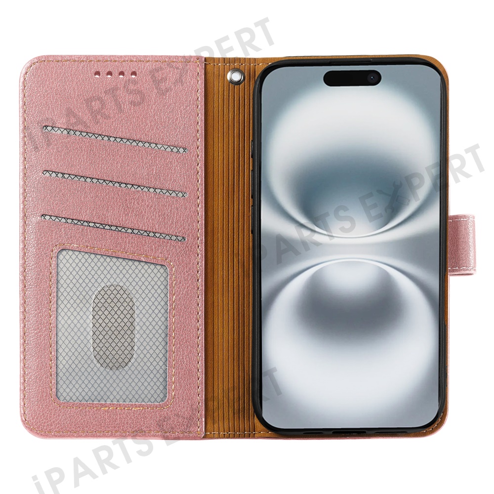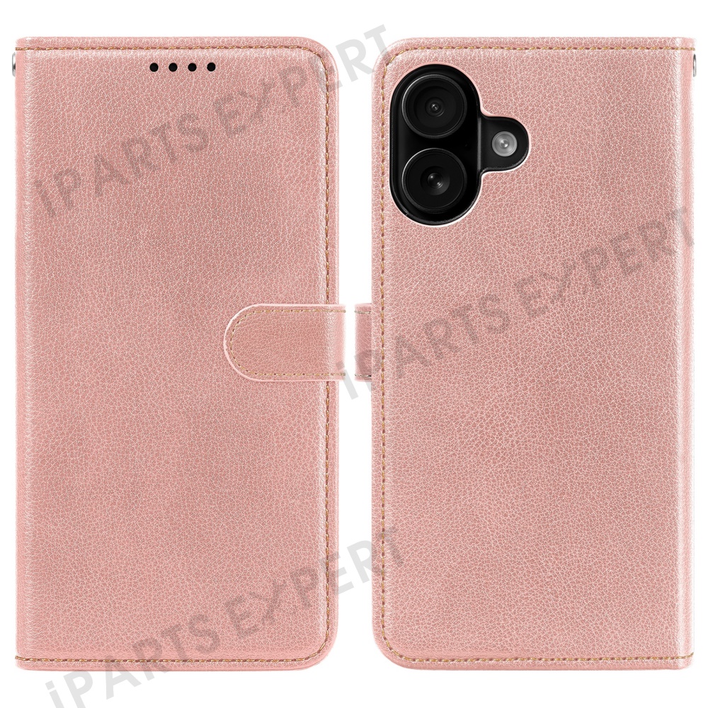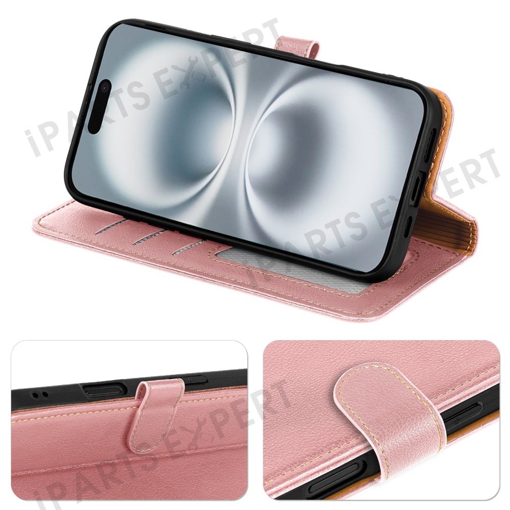 For iPhone 16 Leather Case Litchi Texture Wallet RFID Blocking Phone Cover - Rose Gold