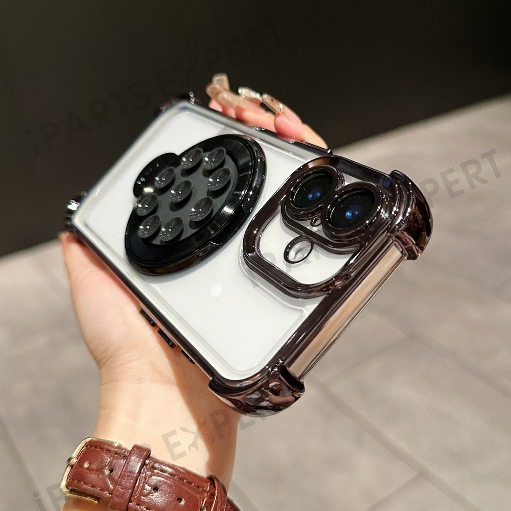 For iPhone 16 Magnetic Case Suction Cup Kickstand PC Phone Cover with Four Corner Airbag - Black