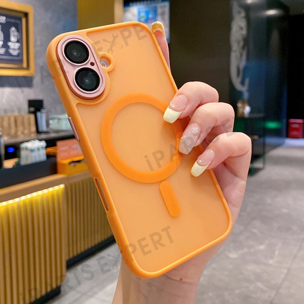 For iPhone 16 Magnetic Case with Lens Film / Detachable Lens Frame Hybrid Phone Back Cover - Orange