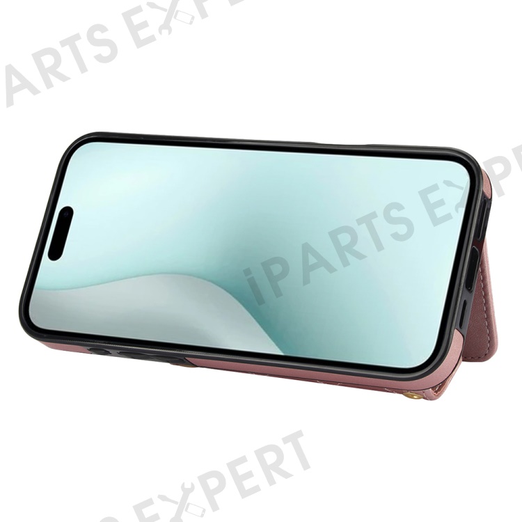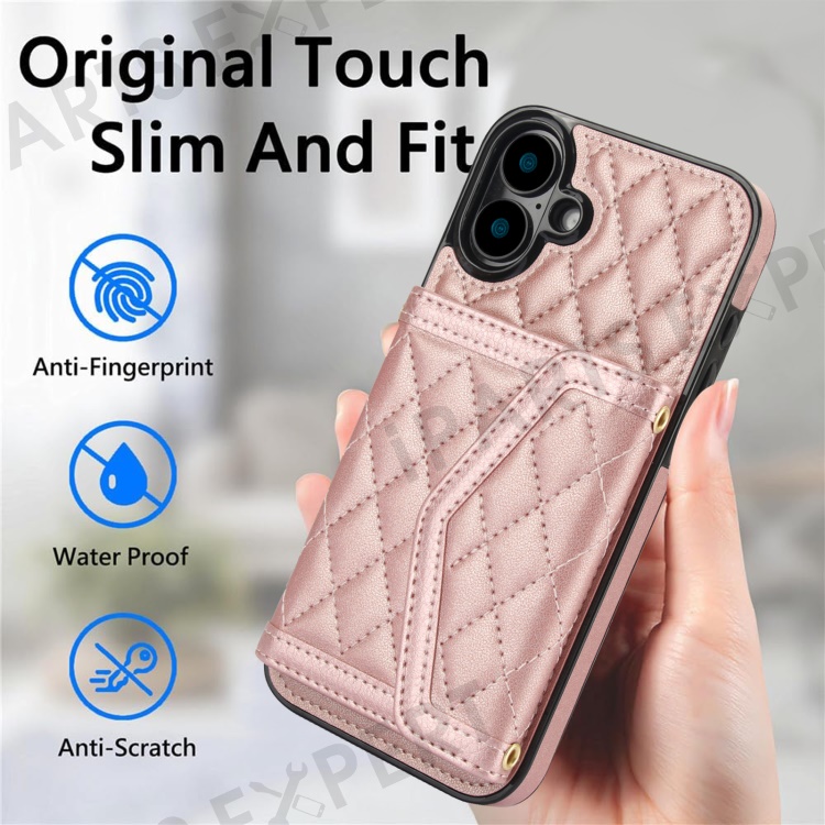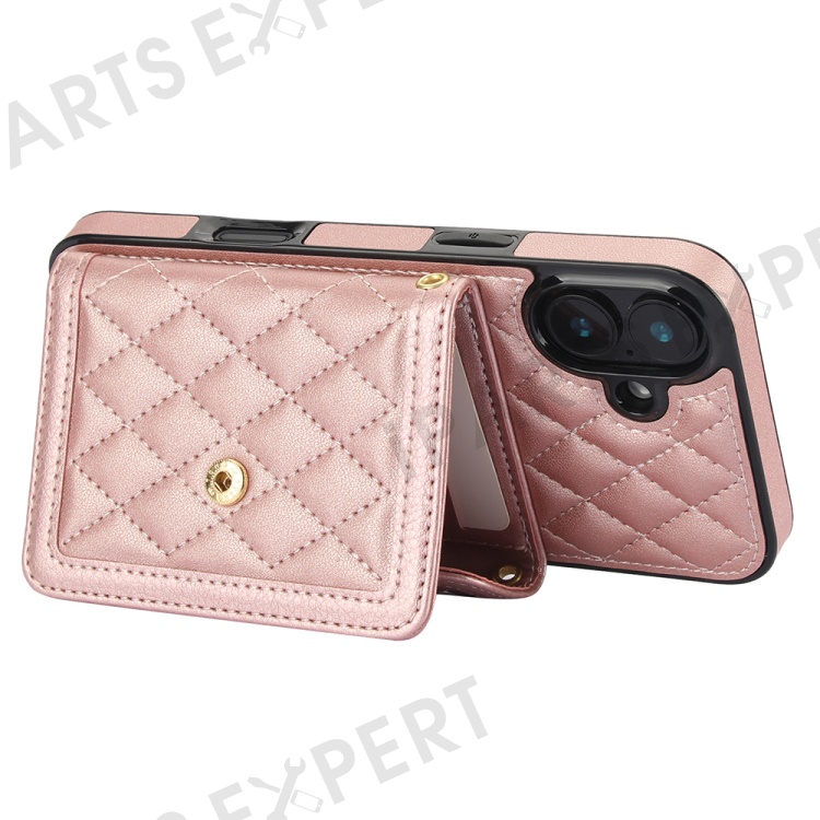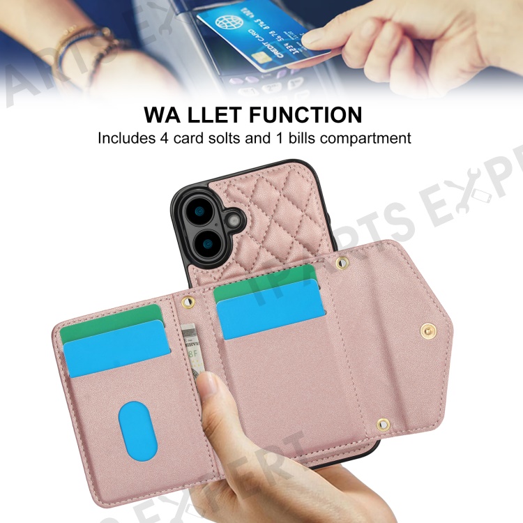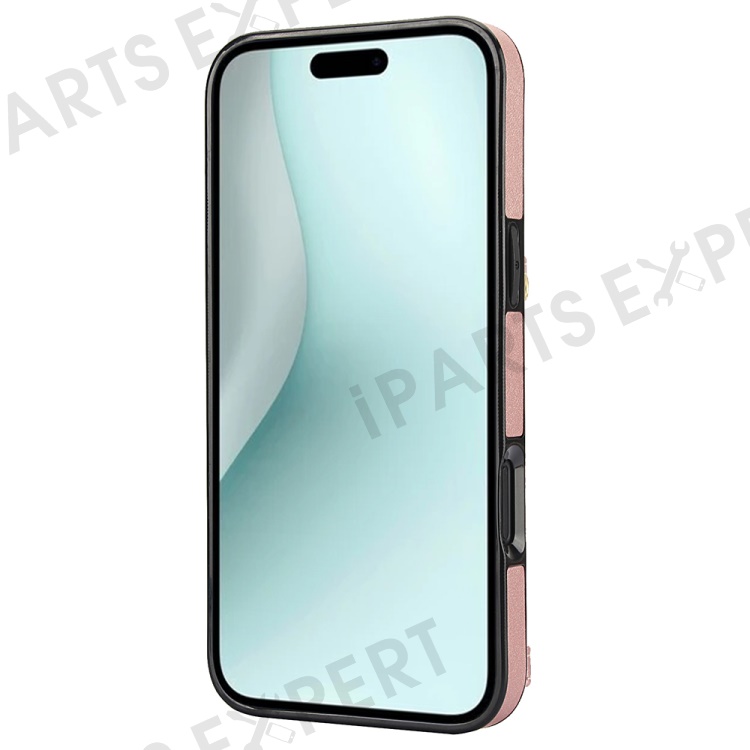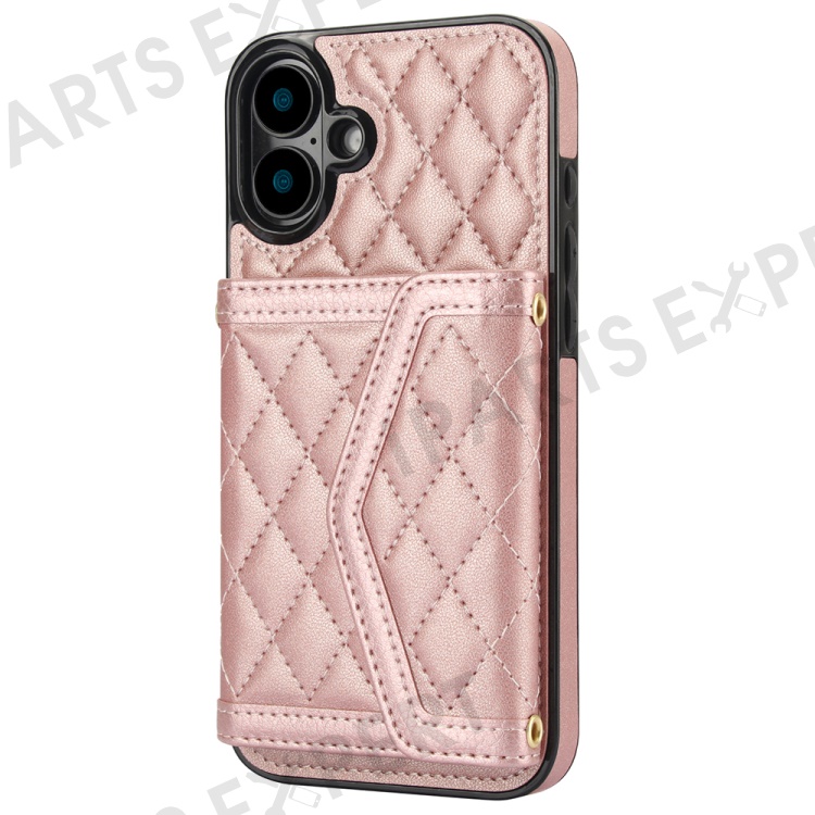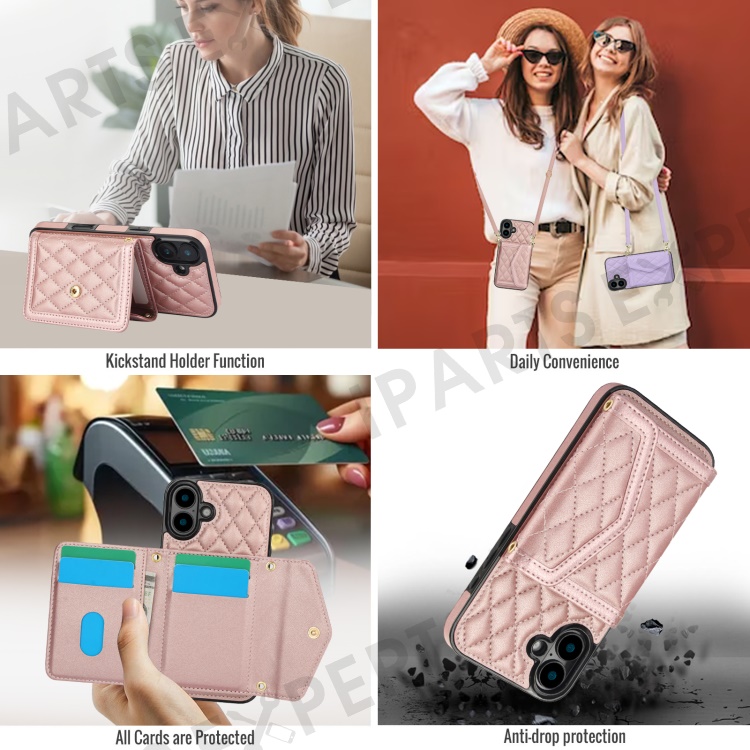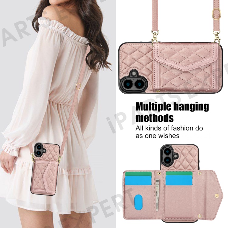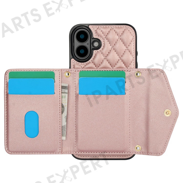 For iPhone 16 Plus Case Card Holders RFID Blocking PU Leather+TPU Phone Cover with Shoulder Strap - Rose Gold