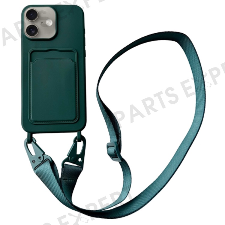 For iPhone 16 Plus Case Liquid Silicone Card Slot Soft Phone Cover with Lanyard Strap - Blackish Green