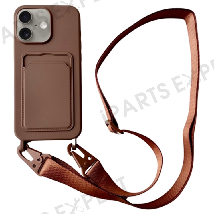 For iPhone 16 Plus Case Liquid Silicone Card Slot Soft Phone Cover with Lanyard Strap - Coffee