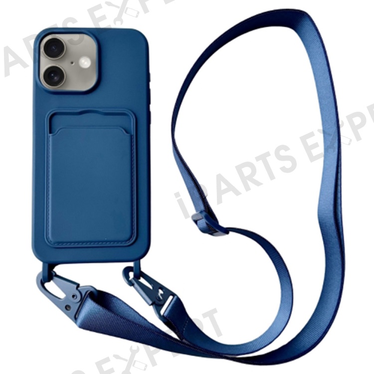 For iPhone 16 Plus Case Liquid Silicone Card Slot Soft Phone Cover with Lanyard Strap - Navy Blue