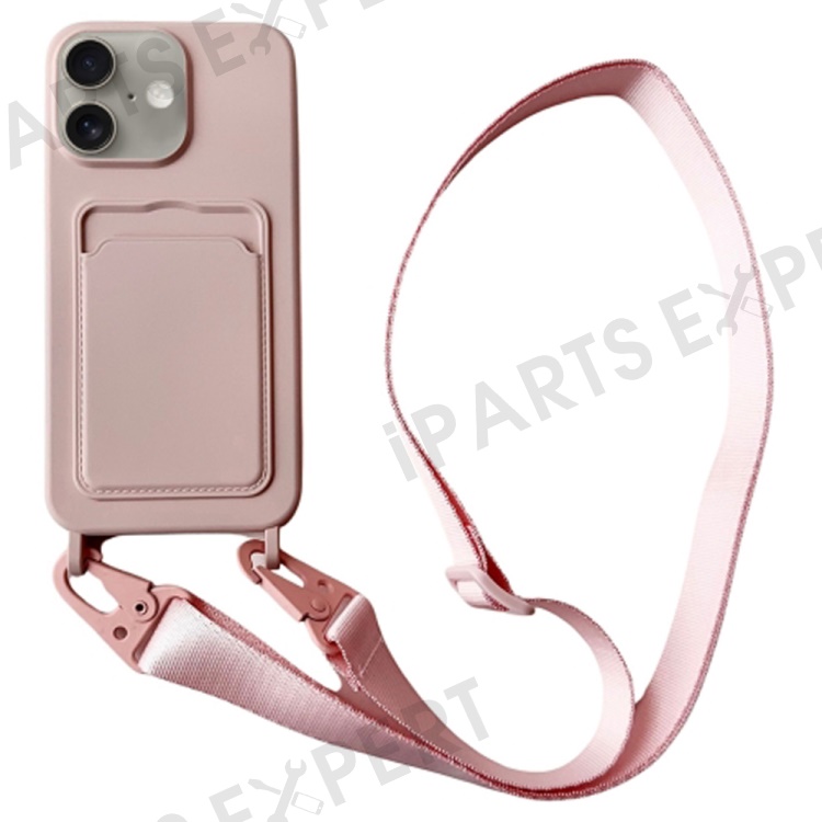 For iPhone 16 Plus Case Liquid Silicone Card Slot Soft Phone Cover with Lanyard Strap - Pink