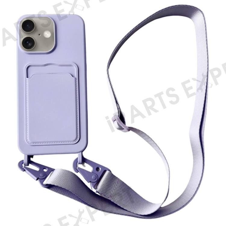 For iPhone 16 Plus Case Liquid Silicone Card Slot Soft Phone Cover with Lanyard Strap - Purple