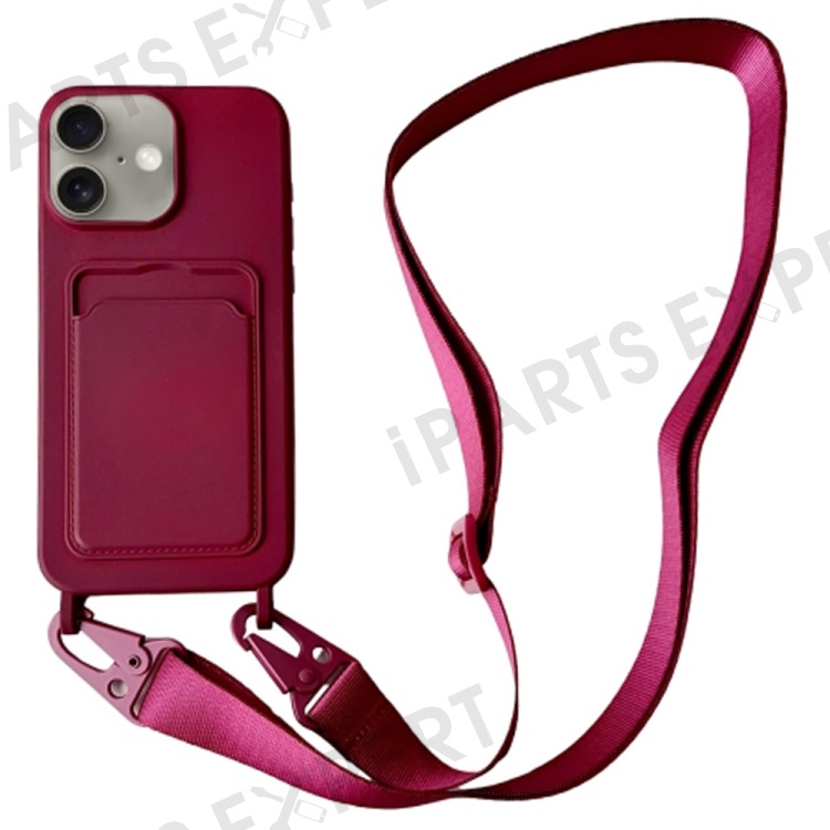 For iPhone 16 Plus Case Liquid Silicone Card Slot Soft Phone Cover with Lanyard Strap - Wine Red