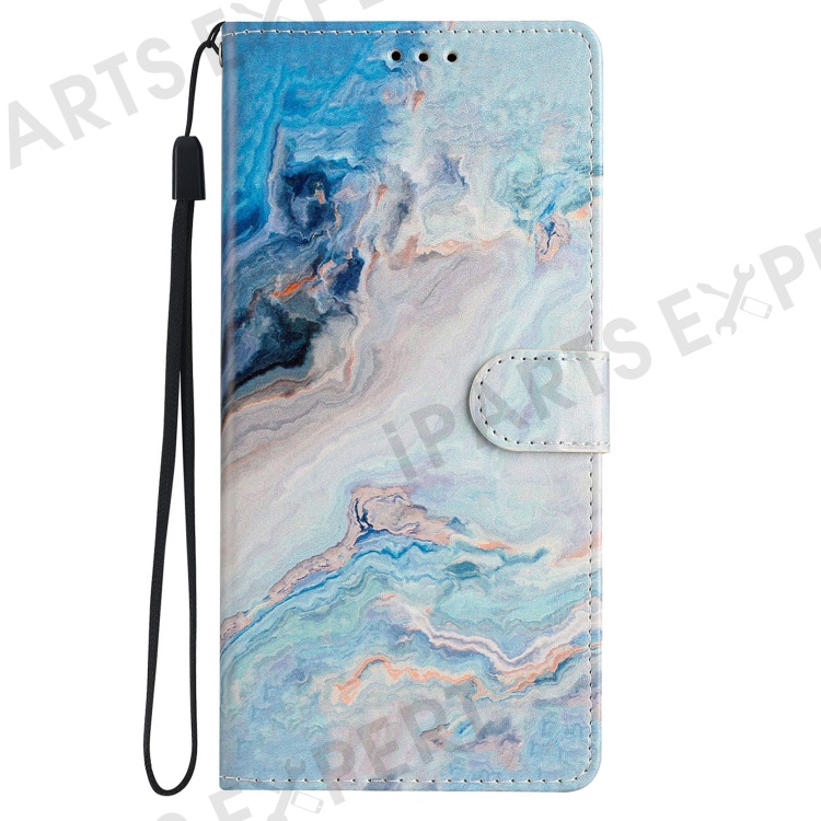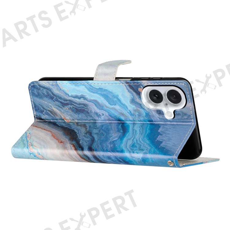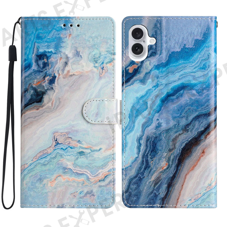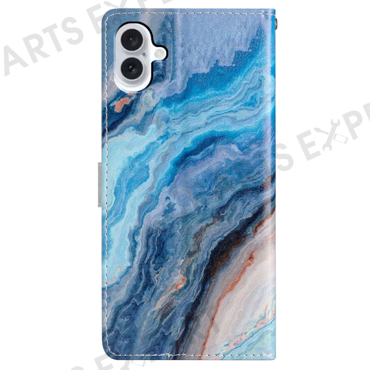 For iPhone 16 Plus Case Print Pattern Design PU Leather Phone Cover with Card Slots Wrist Strap - Blue Marble