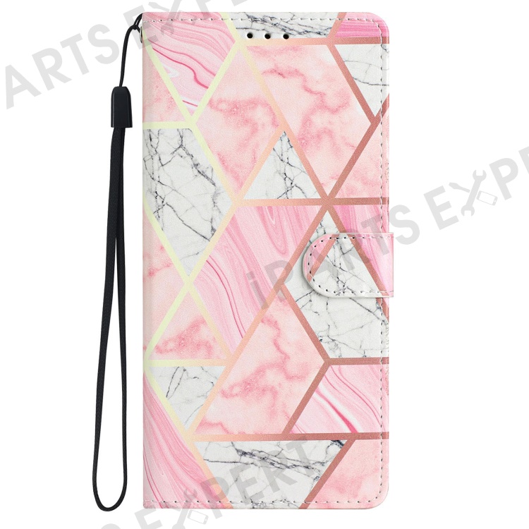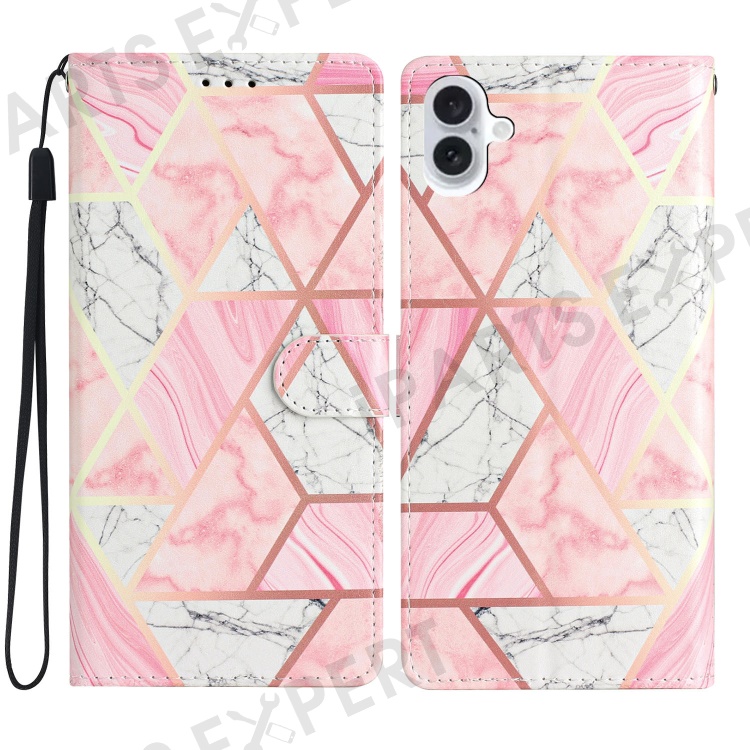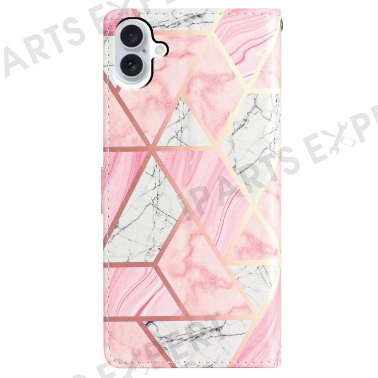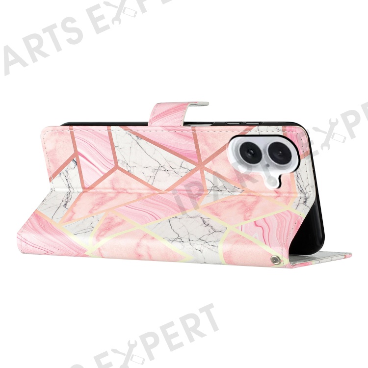 For iPhone 16 Plus Case Print Pattern Design PU Leather Phone Cover with Card Slots Wrist Strap - Pink Marble