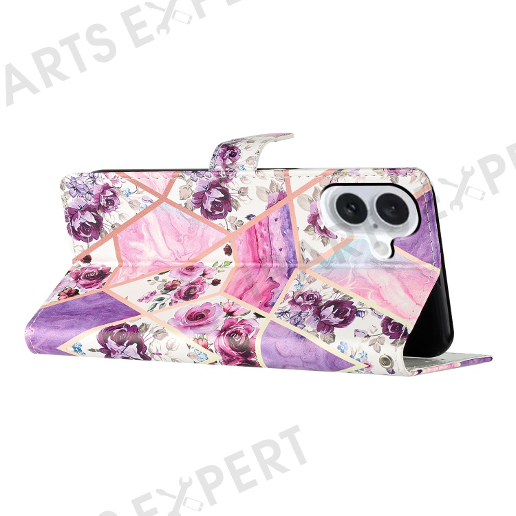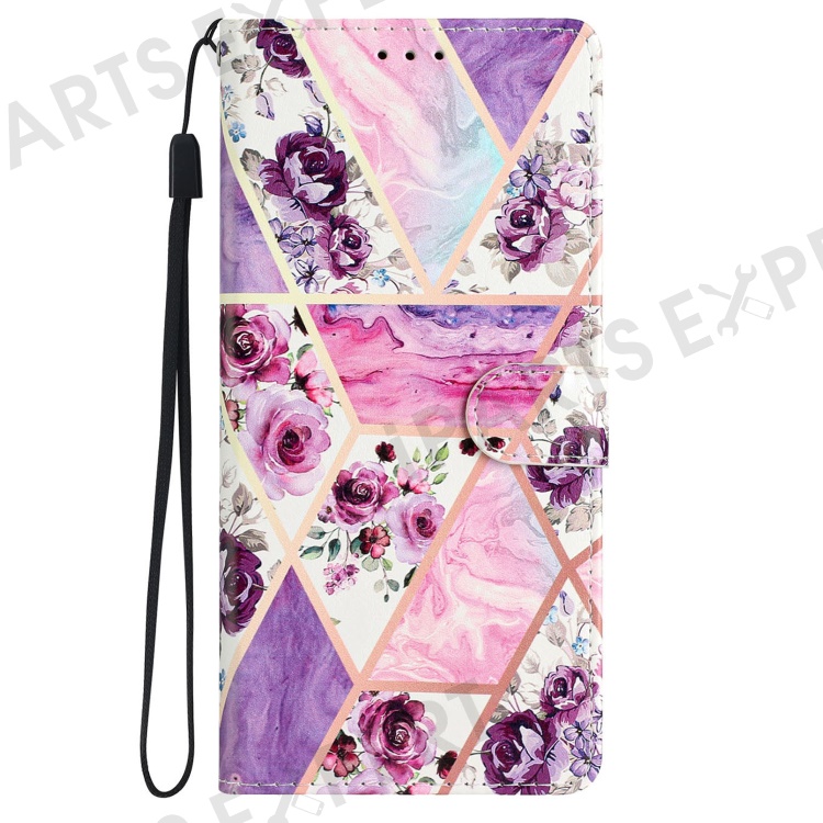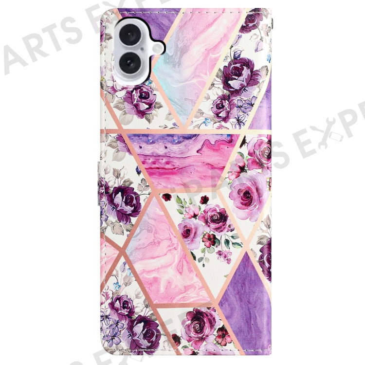 For iPhone 16 Plus Case Print Pattern Design PU Leather Phone Cover with Card Slots Wrist Strap - Purple Flowers