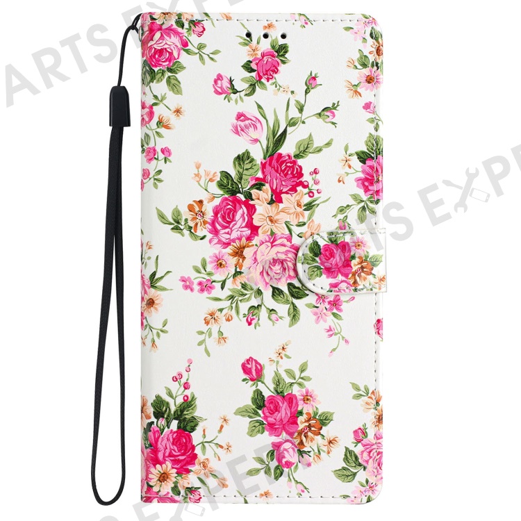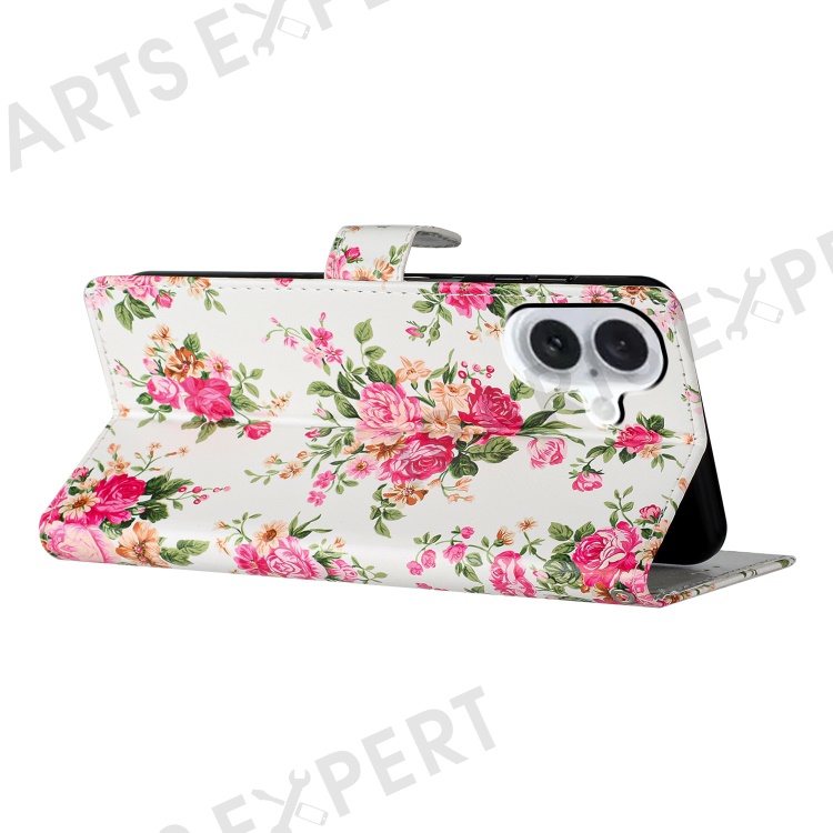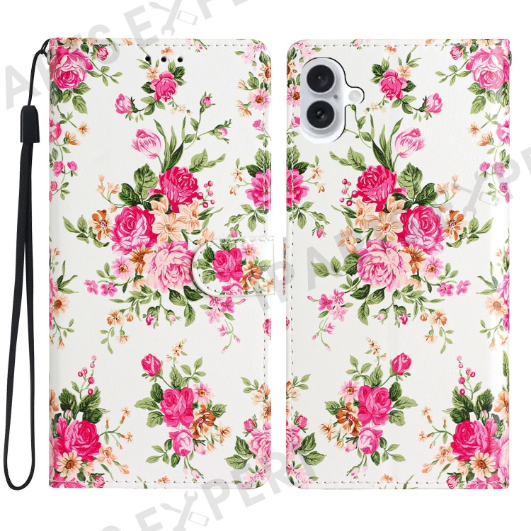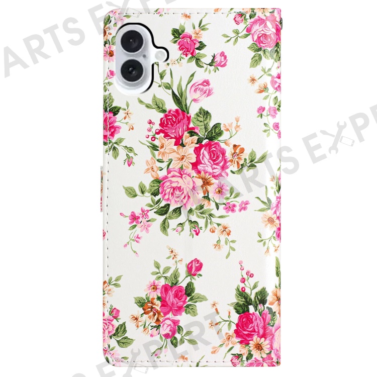 For iPhone 16 Plus Case Print Pattern Design PU Leather Phone Cover with Card Slots Wrist Strap - Red Flowers