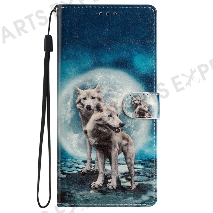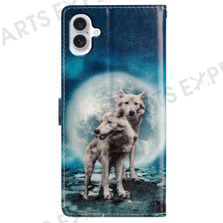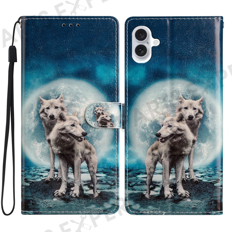 For iPhone 16 Plus Case Print Pattern Design PU Leather Phone Cover with Card Slots Wrist Strap - Two Wolves