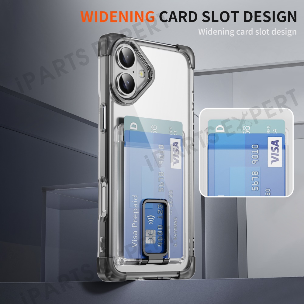 For iPhone 16 Plus Case Reinforced Corners TPU + Acrylic Phone Cover with Kickstand Card Holder - Transparent Black