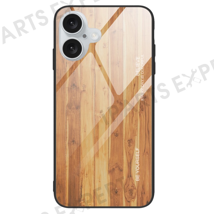 For iPhone 16 Plus Case TPU+Tempered Glass Back Phone Cover Wood Texture - Brown