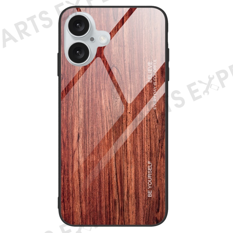For iPhone 16 Plus Case TPU+Tempered Glass Back Phone Cover Wood Texture - Wine Red