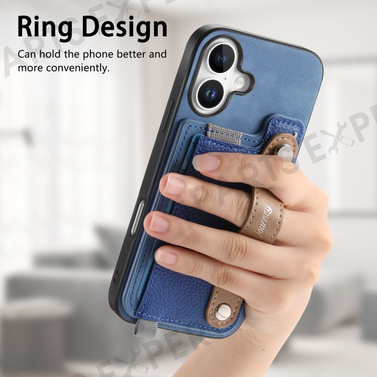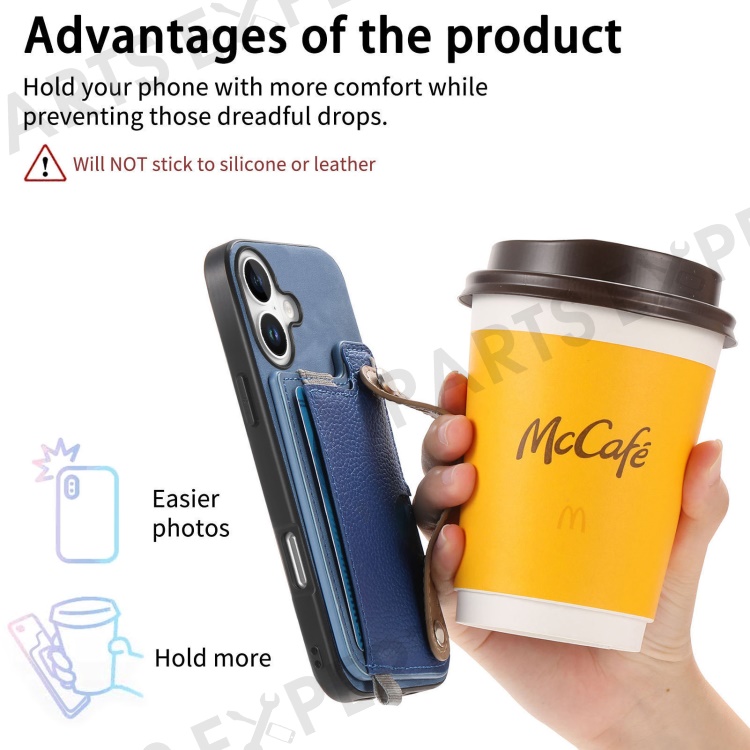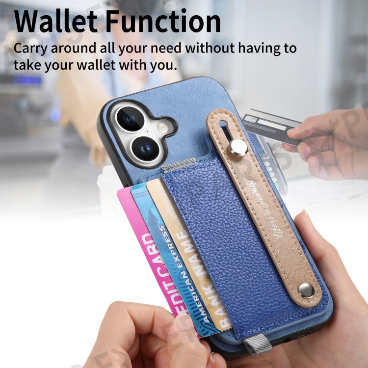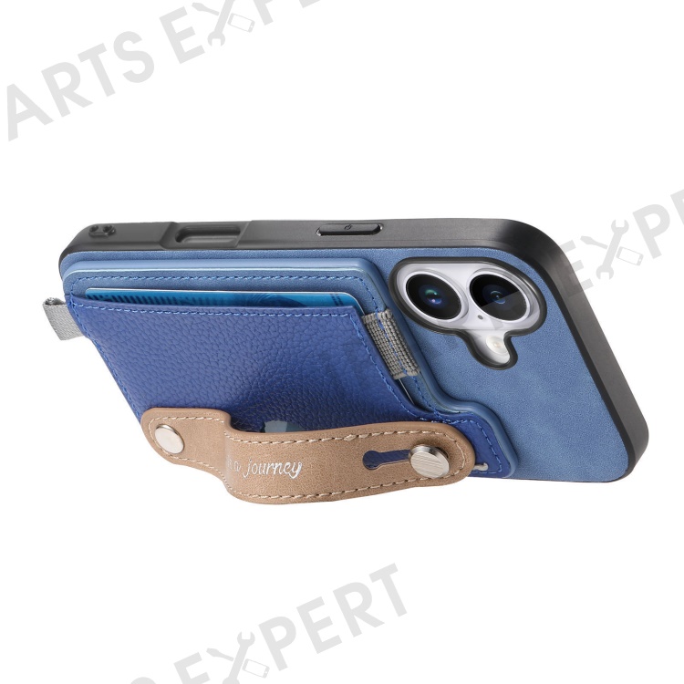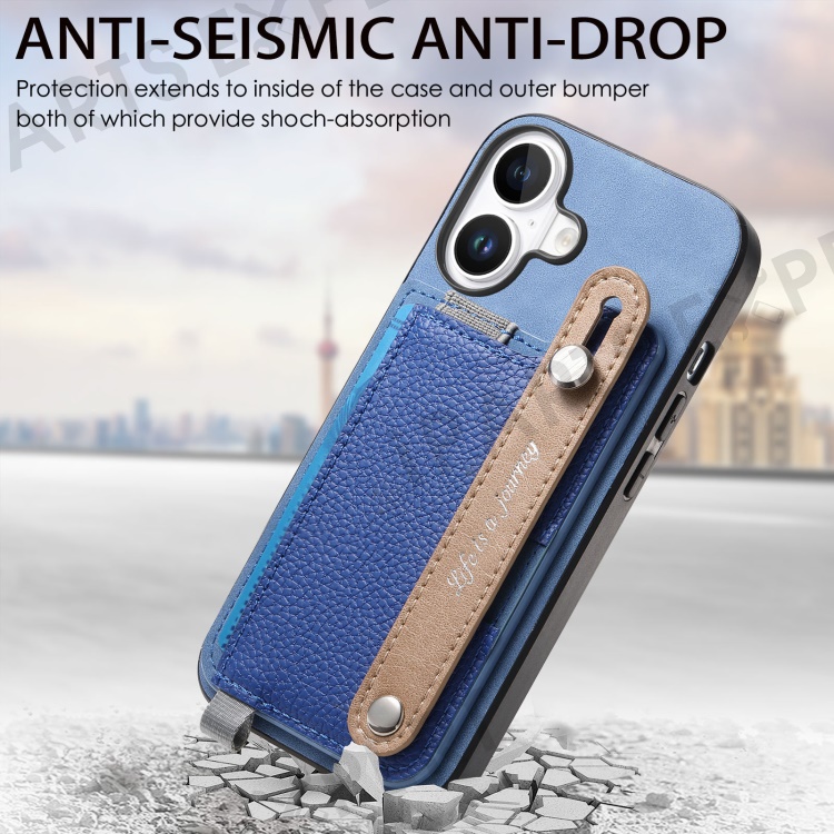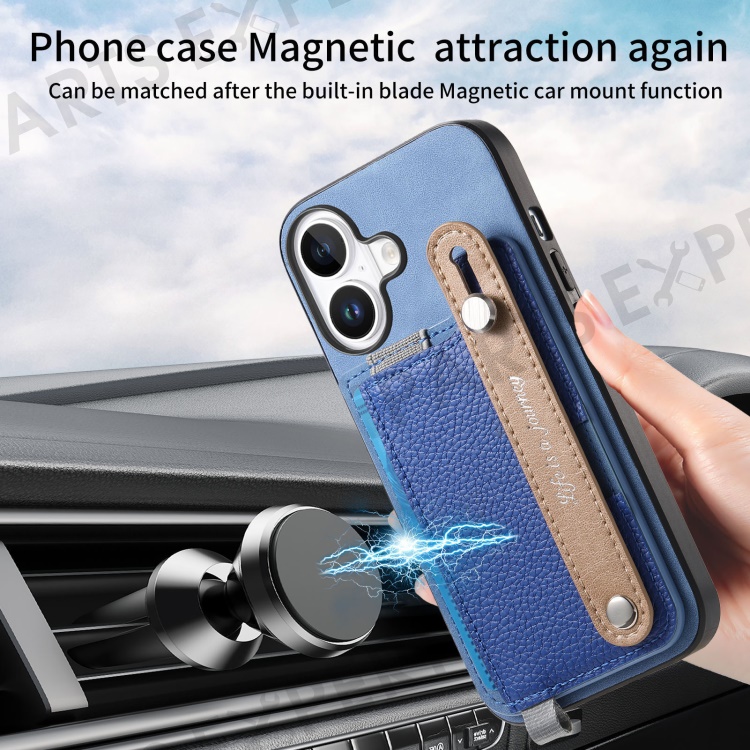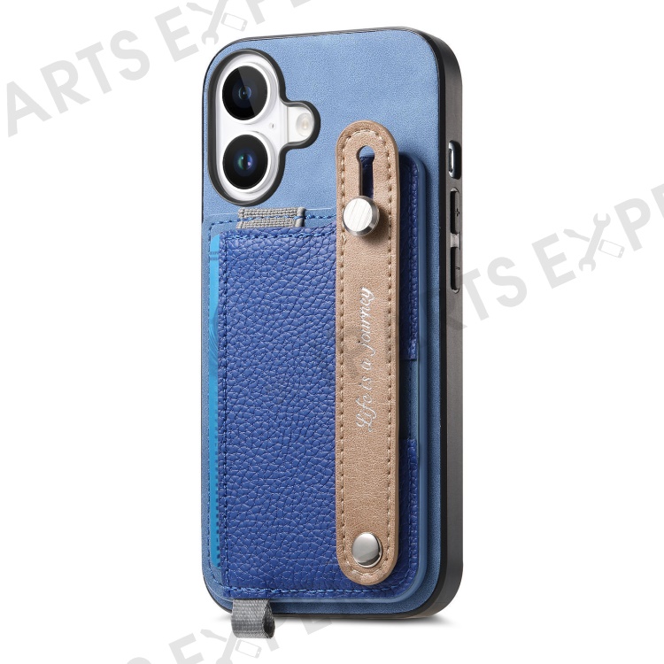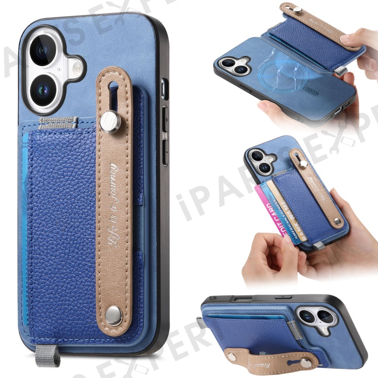 For iPhone 16 Plus Magnetic Leather Back Case with Detachable Card Holder and Wristband - Blue