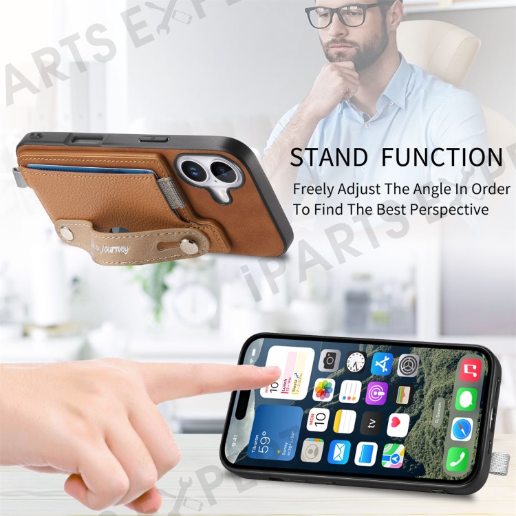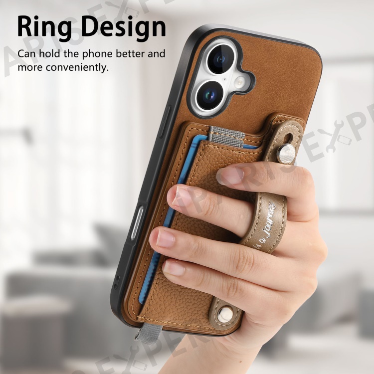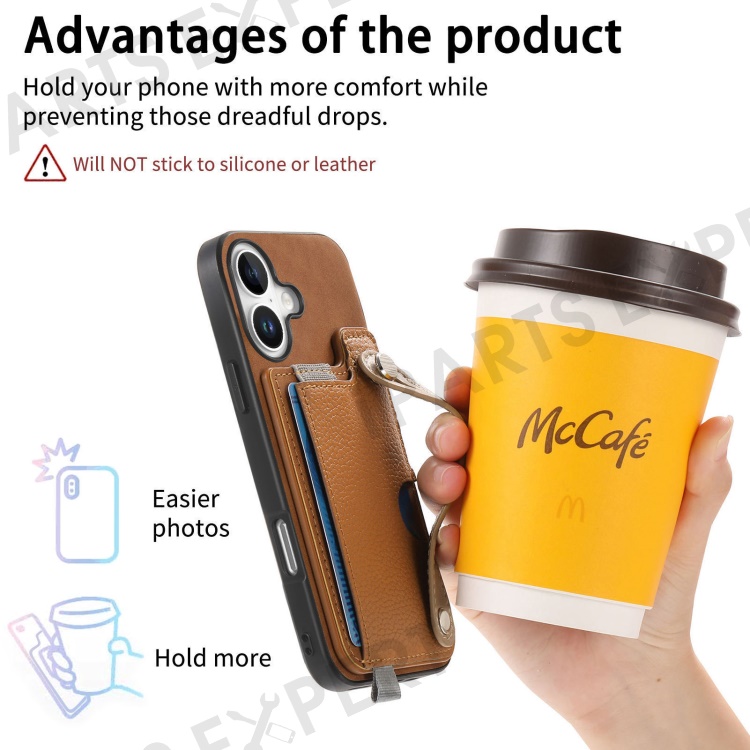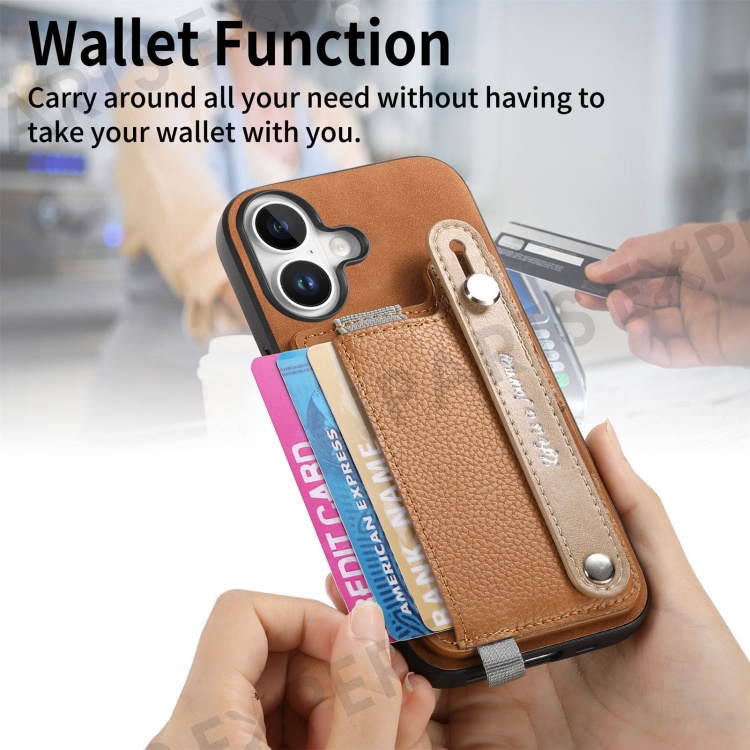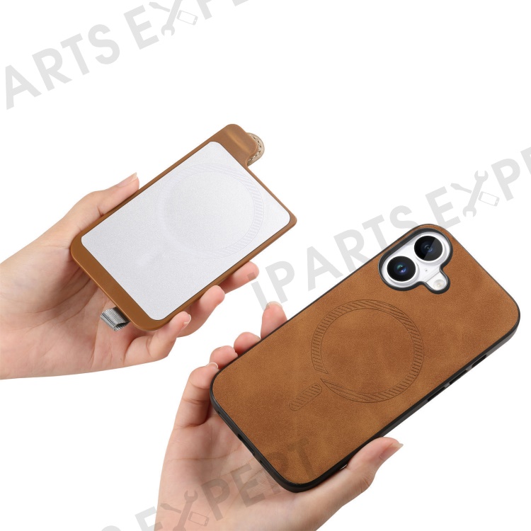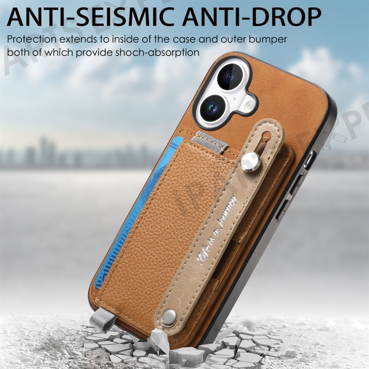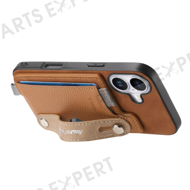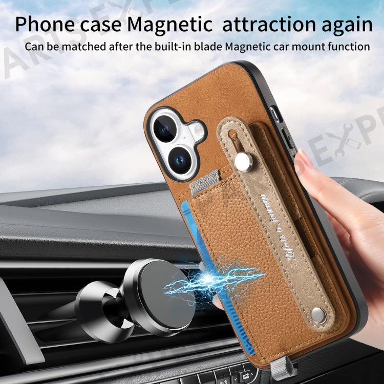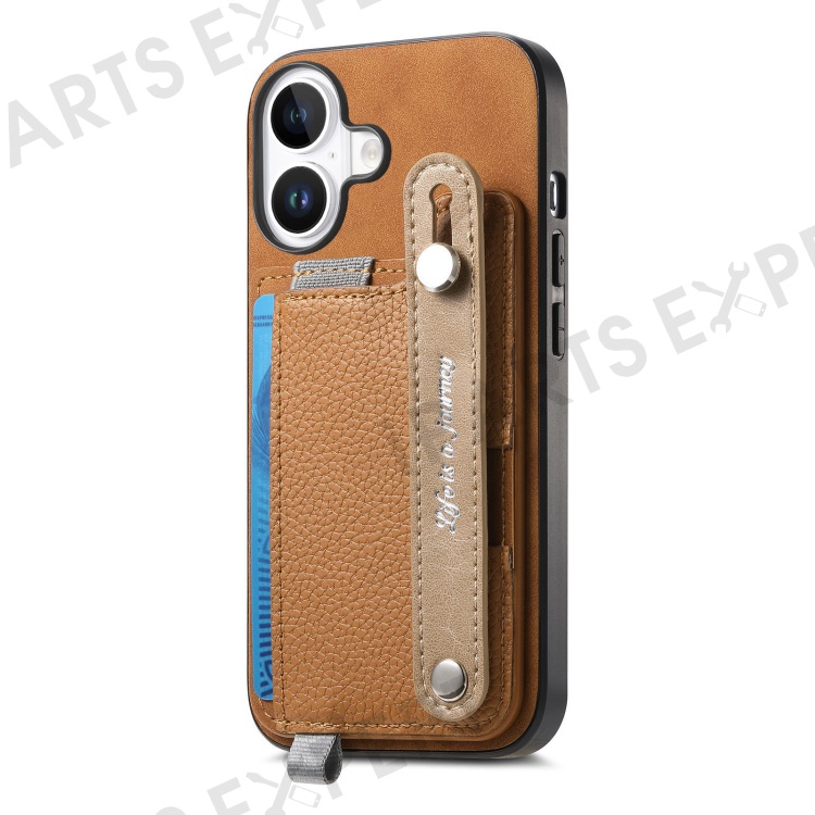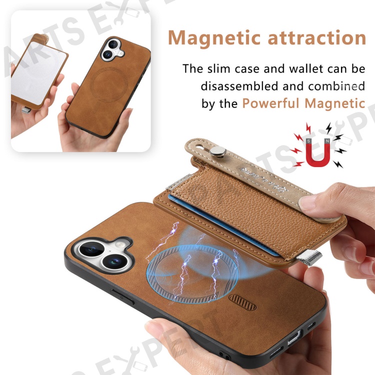 For iPhone 16 Plus Magnetic Leather Back Case with Detachable Card Holder and Wristband - Brown