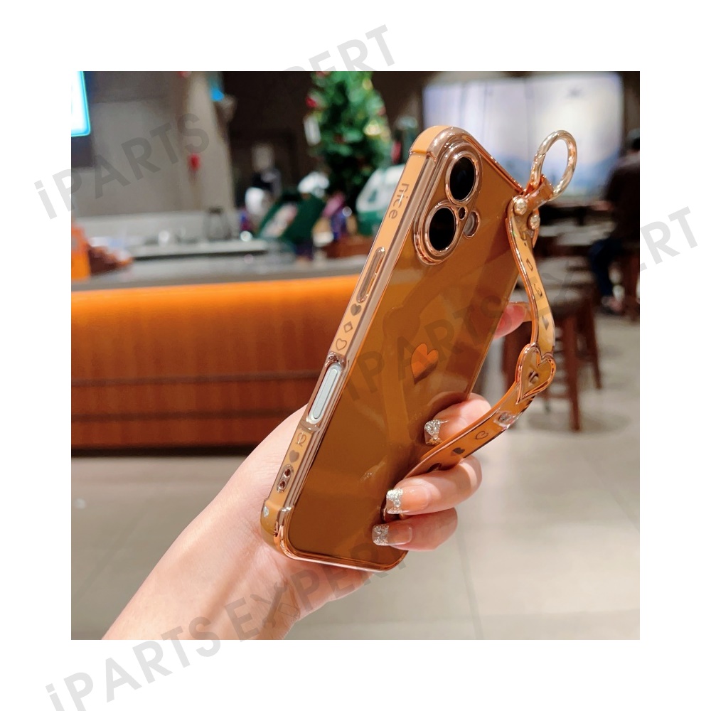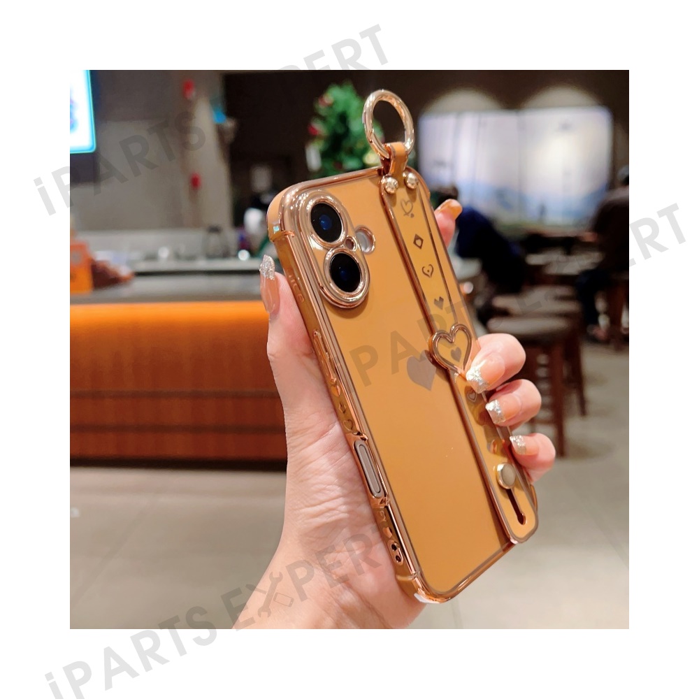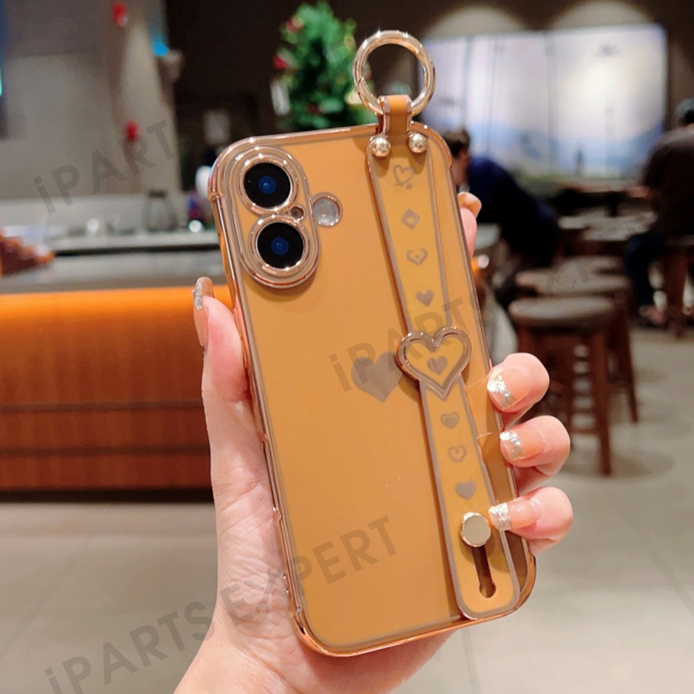 For iPhone 16 Plus Case Wristband Kickstand Love Heart TPU Phone Cover Finger Holder - Brown