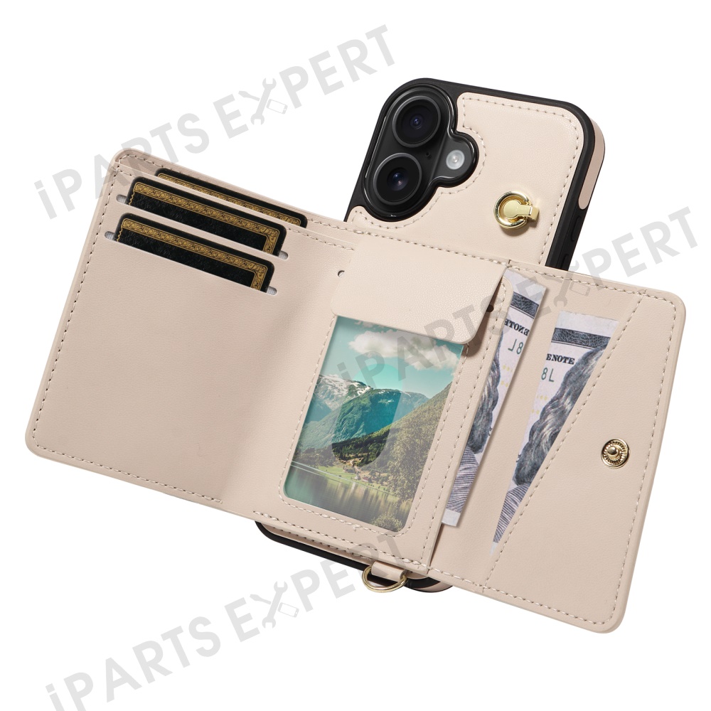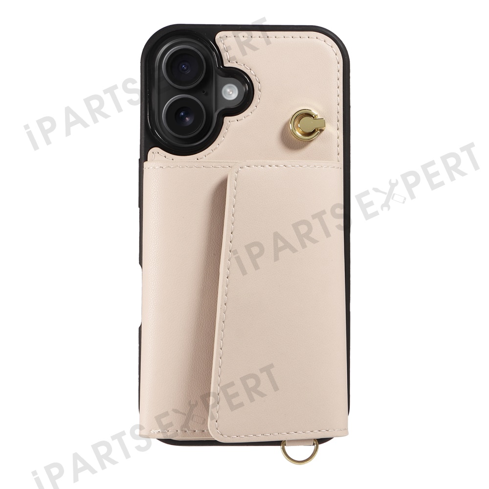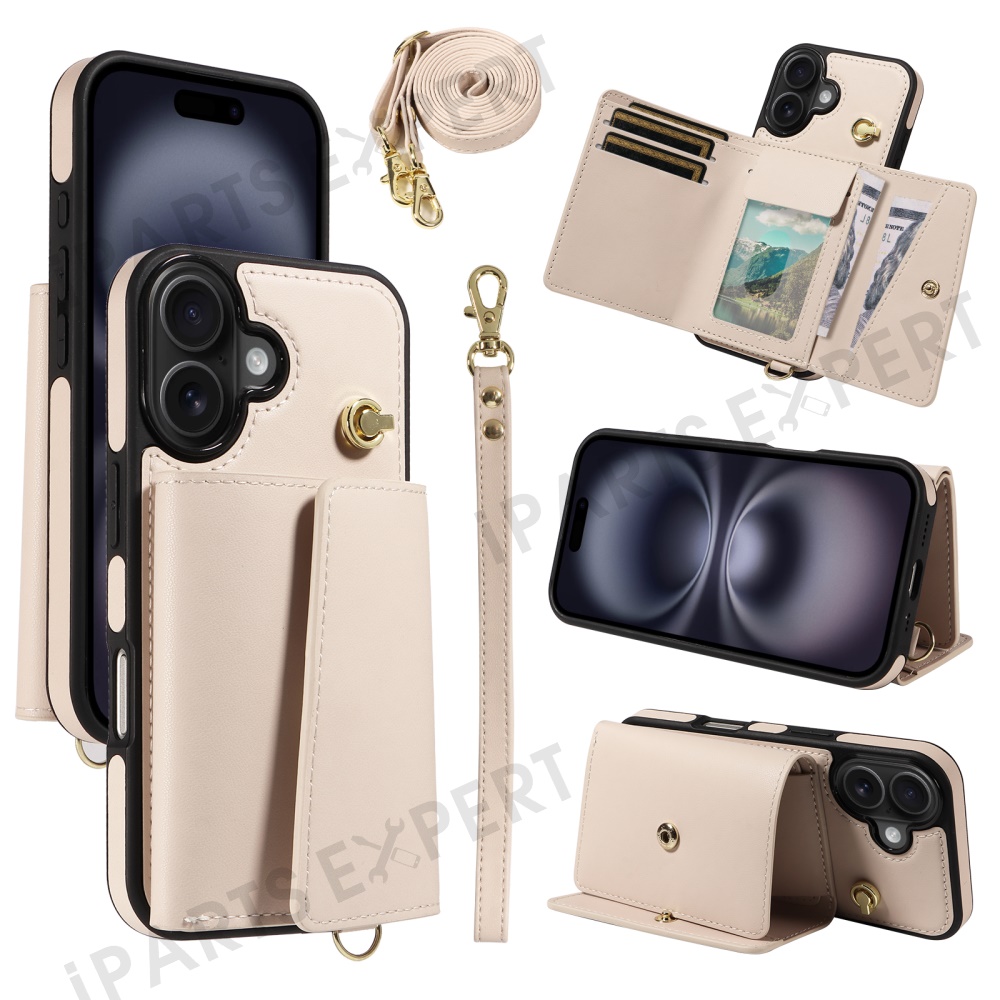 For iPhone 16 Plus Crossbody Phone Case Card Holder Kickstand Leather Coated TPU Mobile Cover - Beige