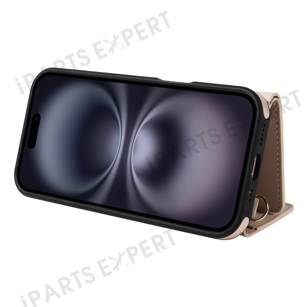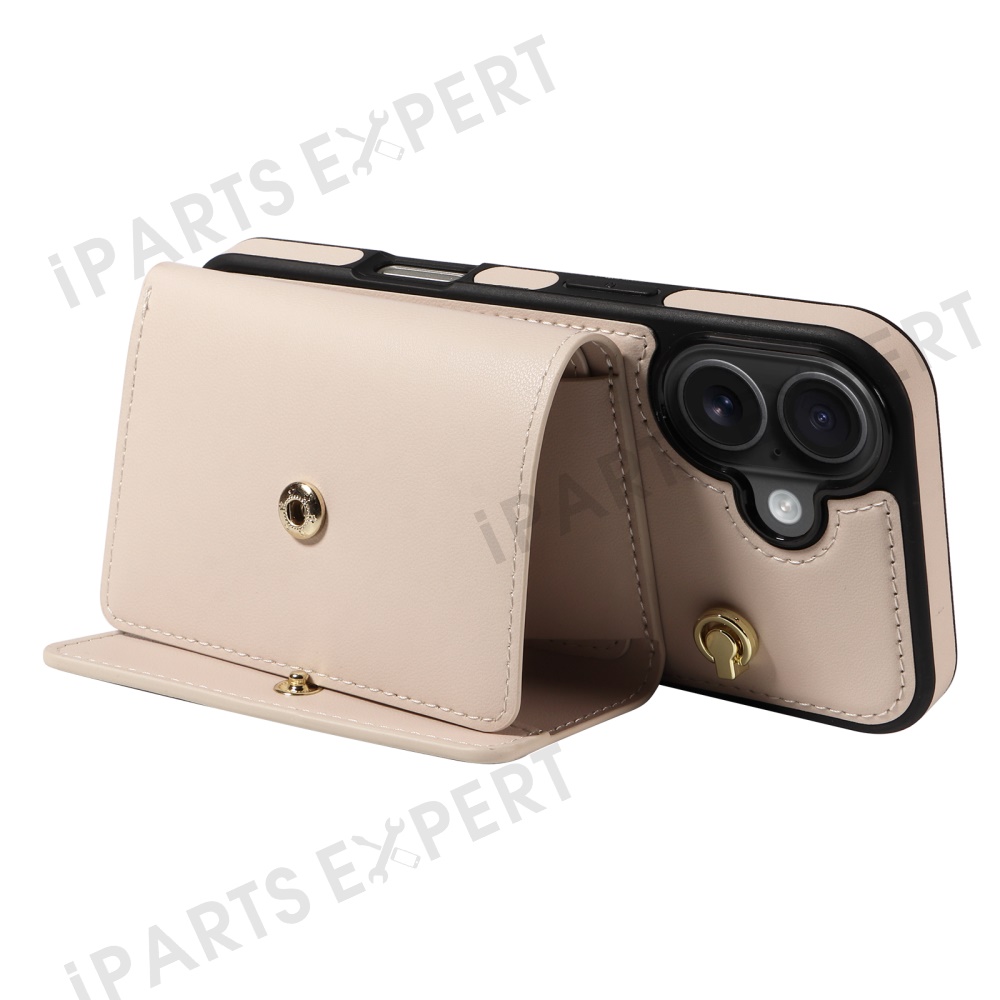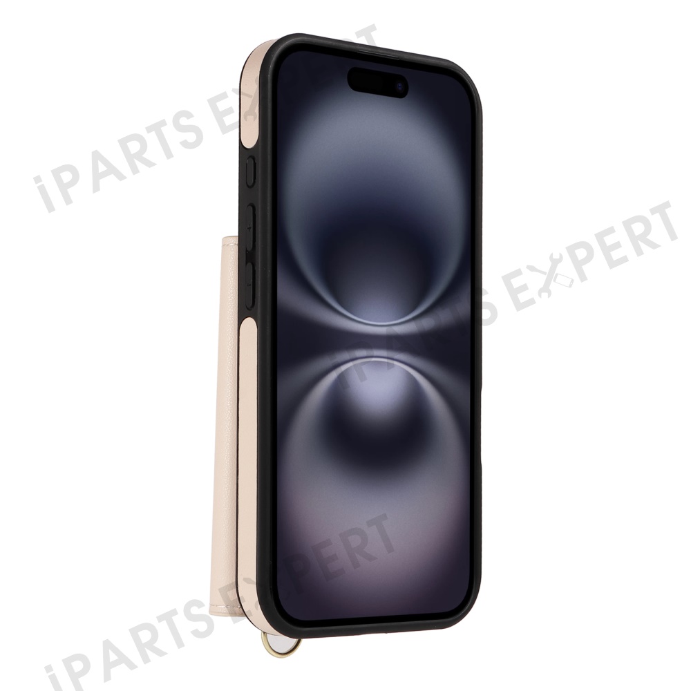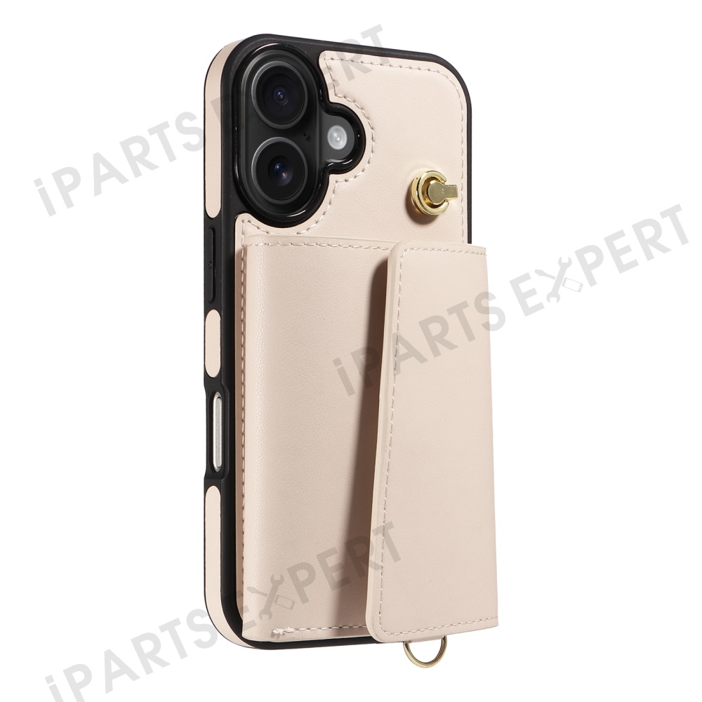For iPhone 16 Plus Crossbody Phone Case Card Holder Kickstand Leather Coated TPU Mobile Cover - Beige