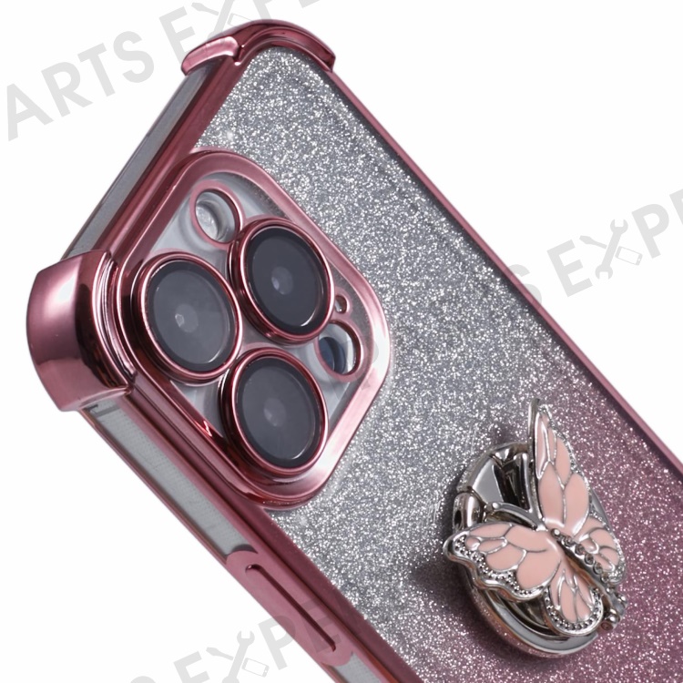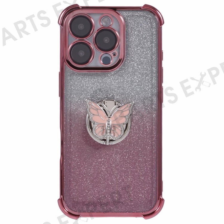 For iPhone 16 Pro Case Butterfly Kickstand Glitter TPU Shockproof Phone Cover - Pink