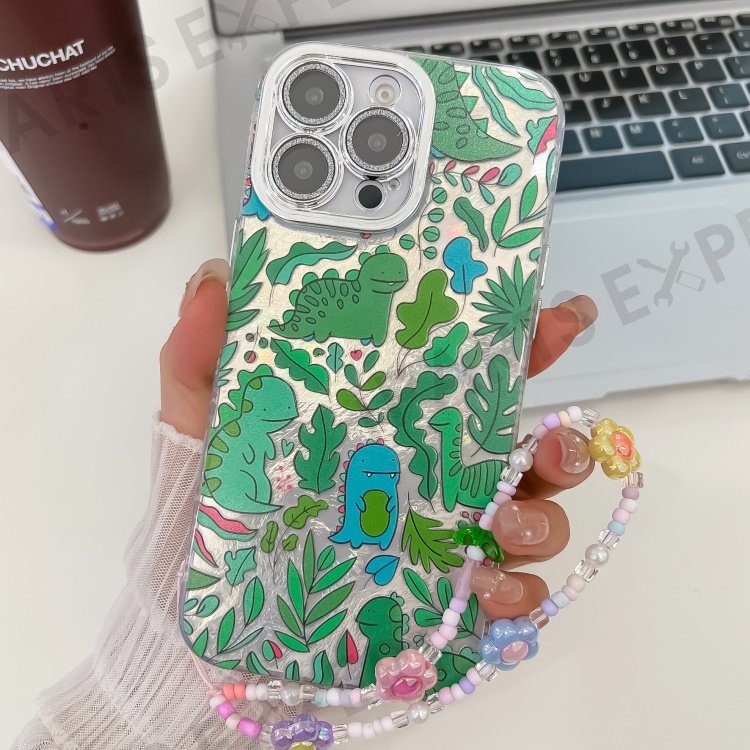 For iPhone 16 Pro Case IMD Cartoon PC+TPU Back Cover with Glass Lens Film, Beaded Strap - MK1
