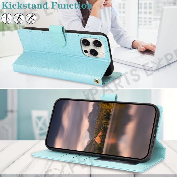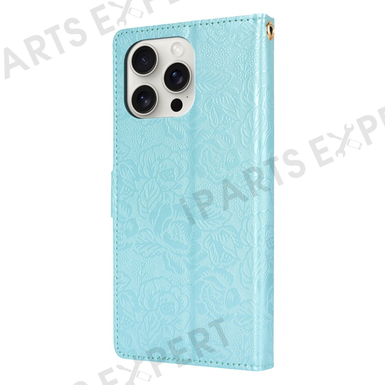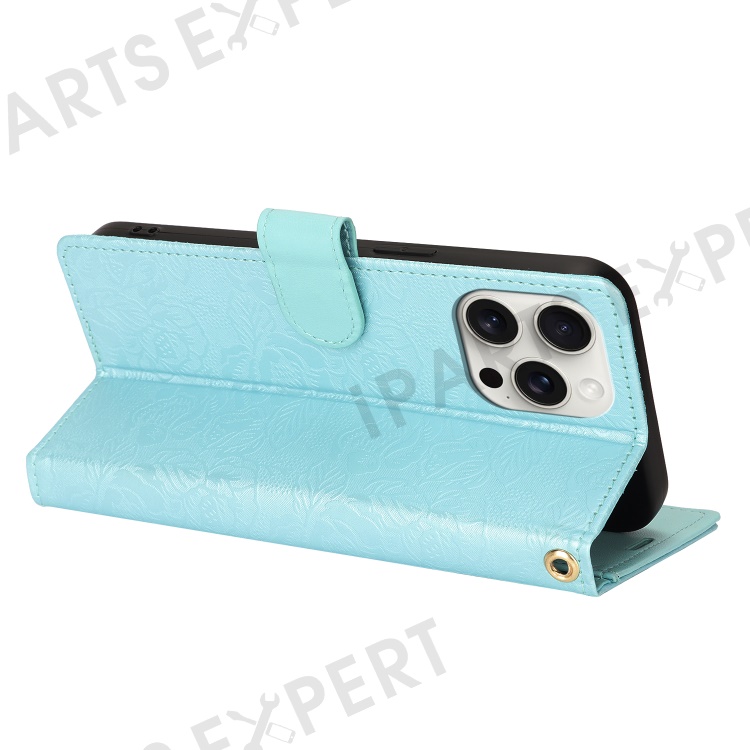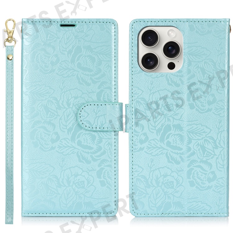 For iPhone 16 Pro Case with Hand Strap Flower Imprint Leather Wallet Phone Cover - Blue