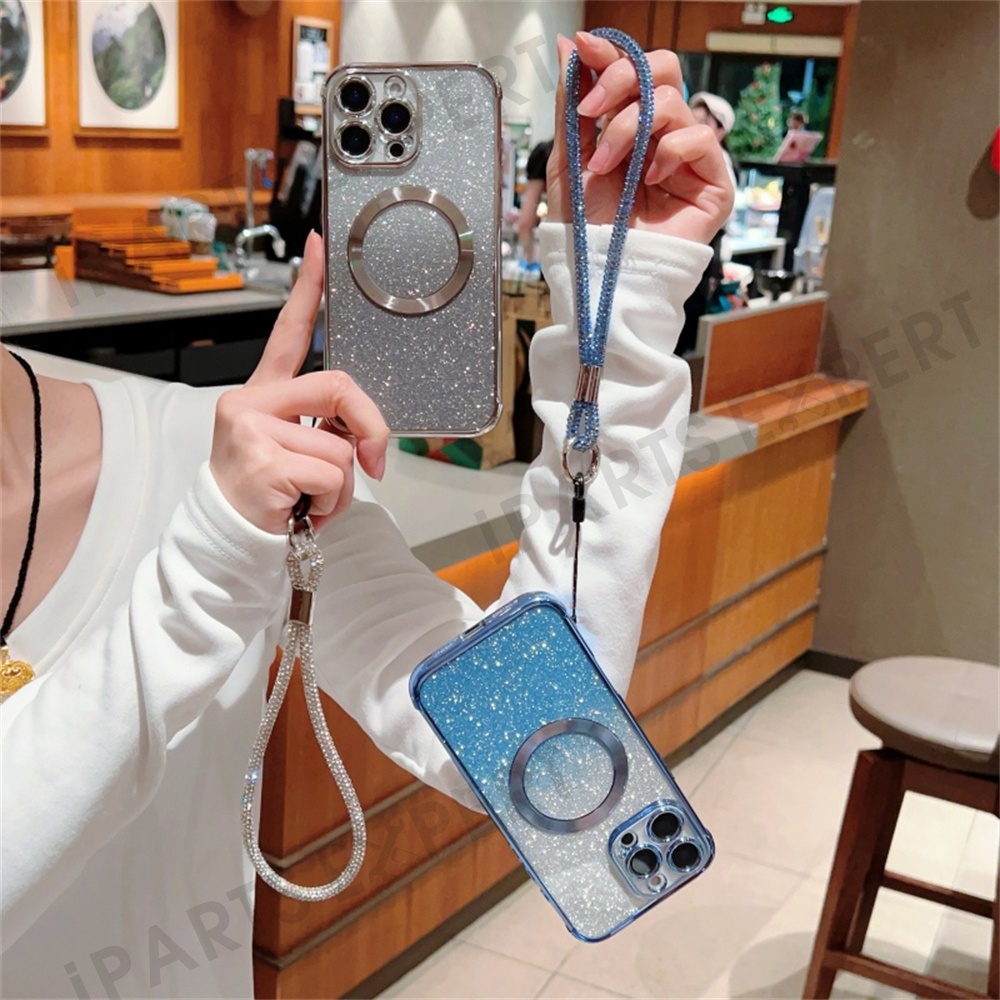 For iPhone 16 Pro Max Case Compatible with MagSafe Electroplated Gradient Glitter Phone Cover with Lanyard - Blue